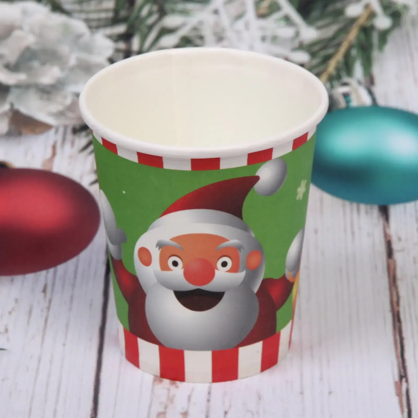 Каждый стакан имеет объем 0,2 литра, что идеально подходит для порции напитка. Изготовлены из качественной бумаги, они безопасны для здоровья и не содержат вредных веществ. Дизайн с изображением Санта-Клауса и красными полосками по краю добавляет праздничного настроения и делает их отличным выбором для новогодних мероприятий.