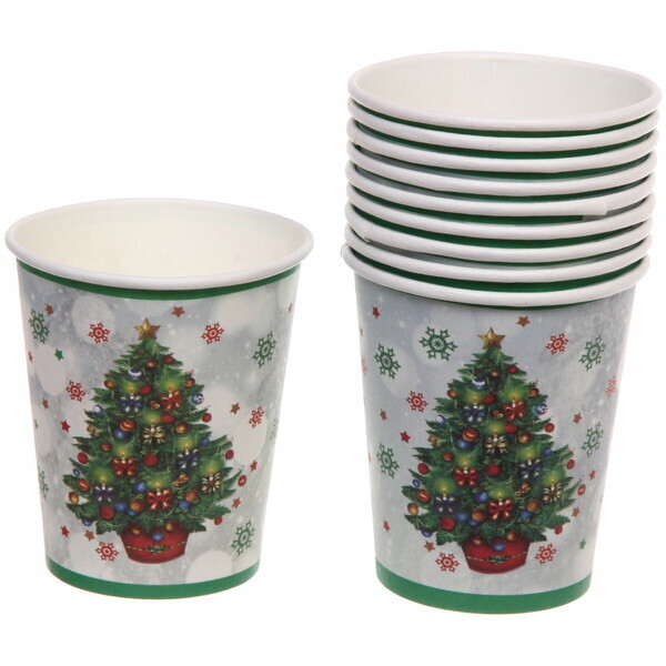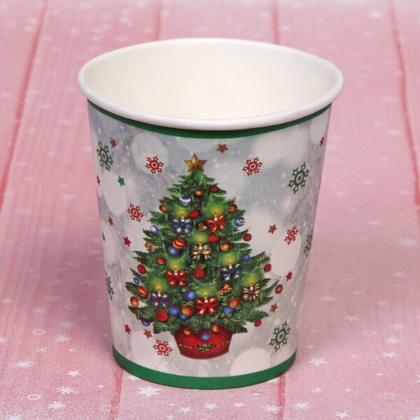 Каждый стакан выполнен из качественной бумаги, что обеспечивает надежность и безопасность при использовании. Стаканы имеют стандартную форму и высоту, что делает их удобными для держания. Дизайн включает белый фон с изображением рождественской ёлки, окруженной снежинками и игрушками, что придаёт им праздничный вид.