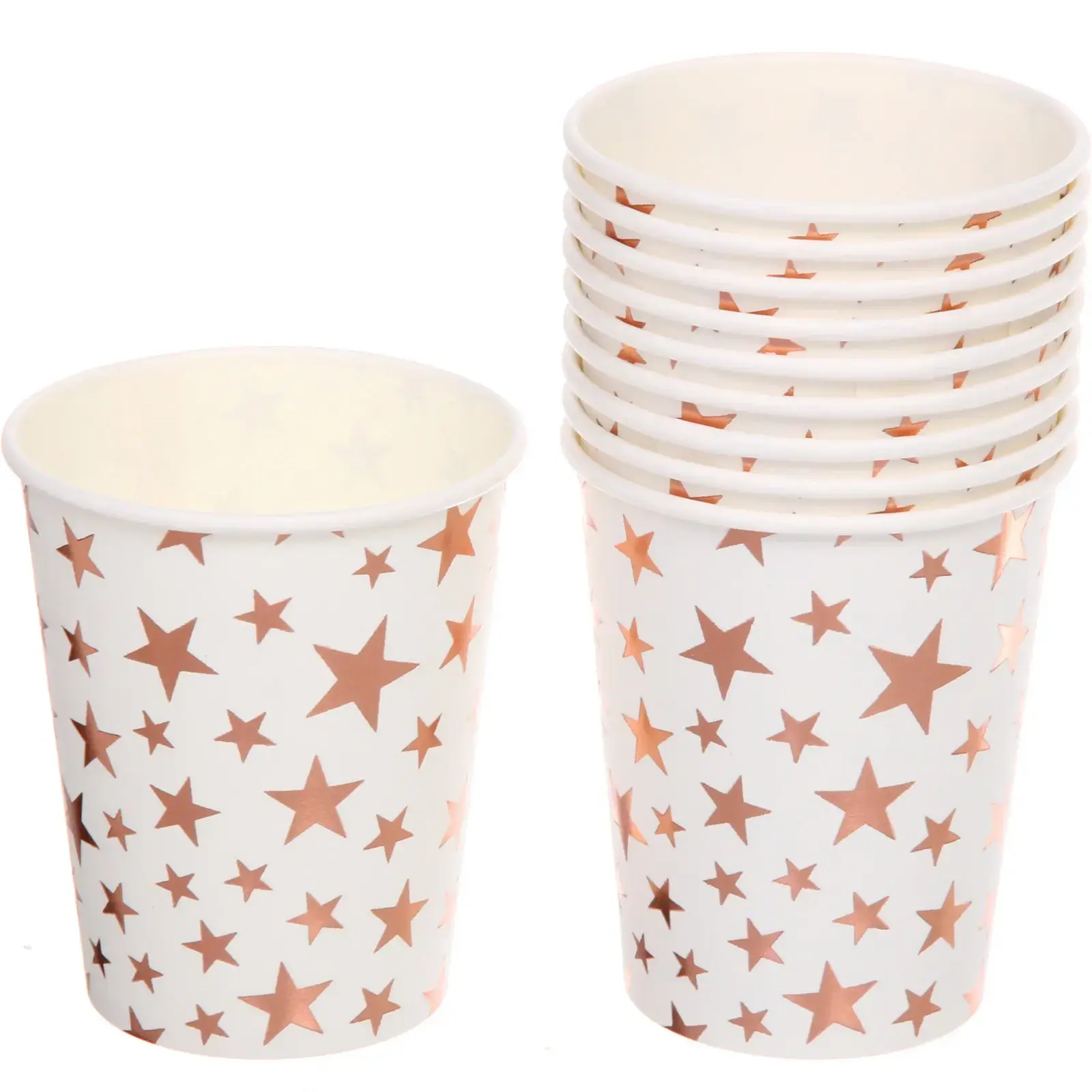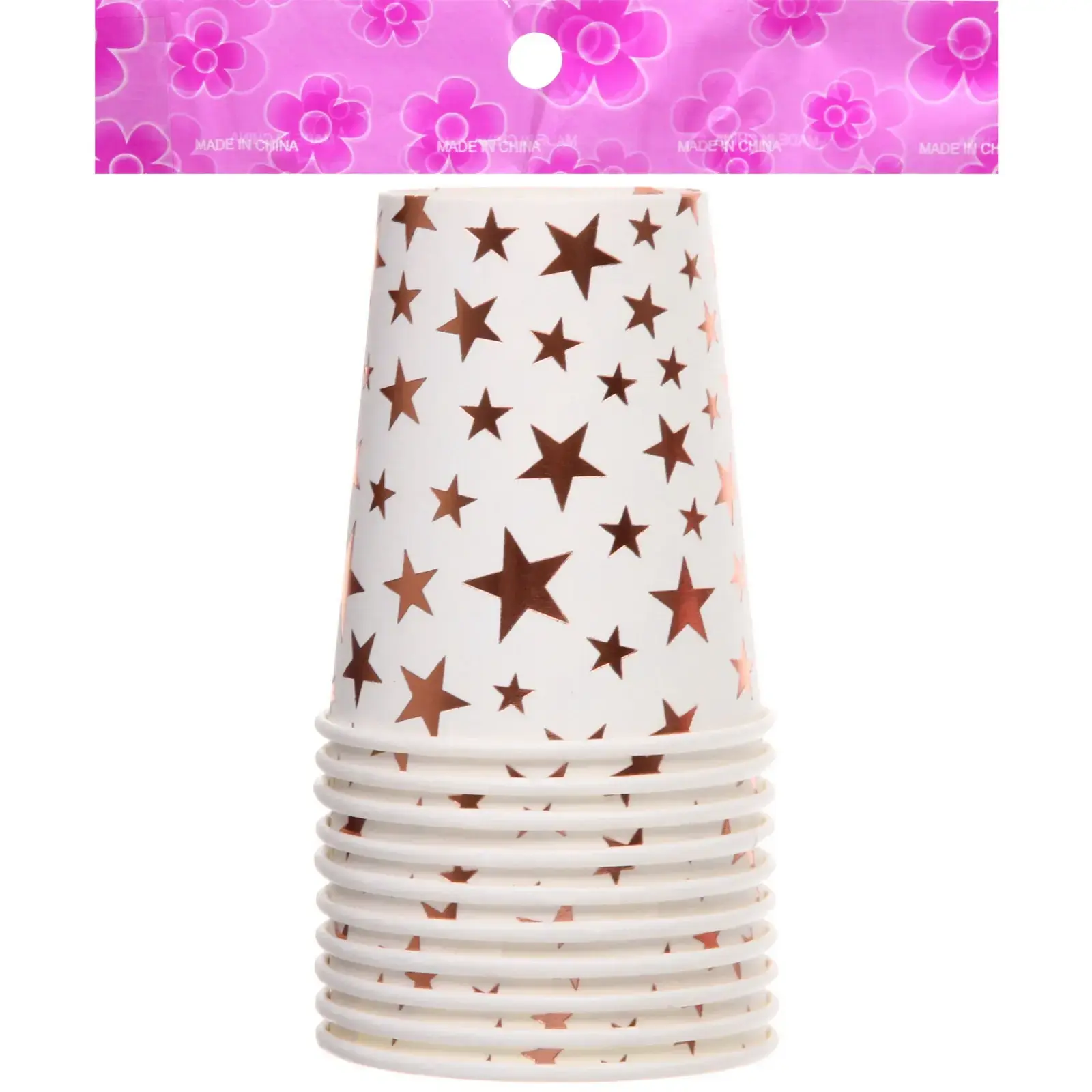 Выбирая наши стаканы, вы получаете не только практичное решение, но и стильный элемент декора. Они изготовлены из качественной бумаги, что гарантирует их прочность и надежность. Розово-золотые звёздочки равномерно распределены по всей поверхности, создавая праздничное настроение. Удобная упаковка в наборе из 10 штук позволяет легко организовать любое мероприятие.
