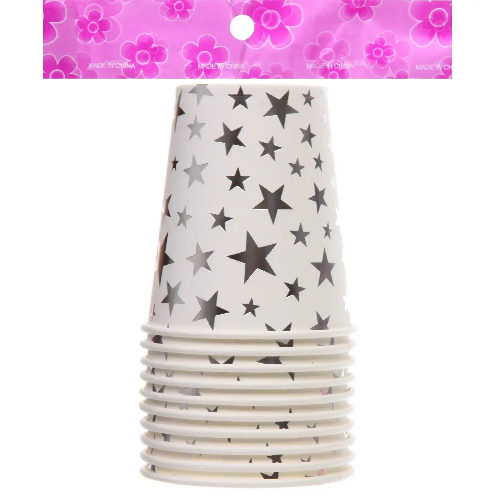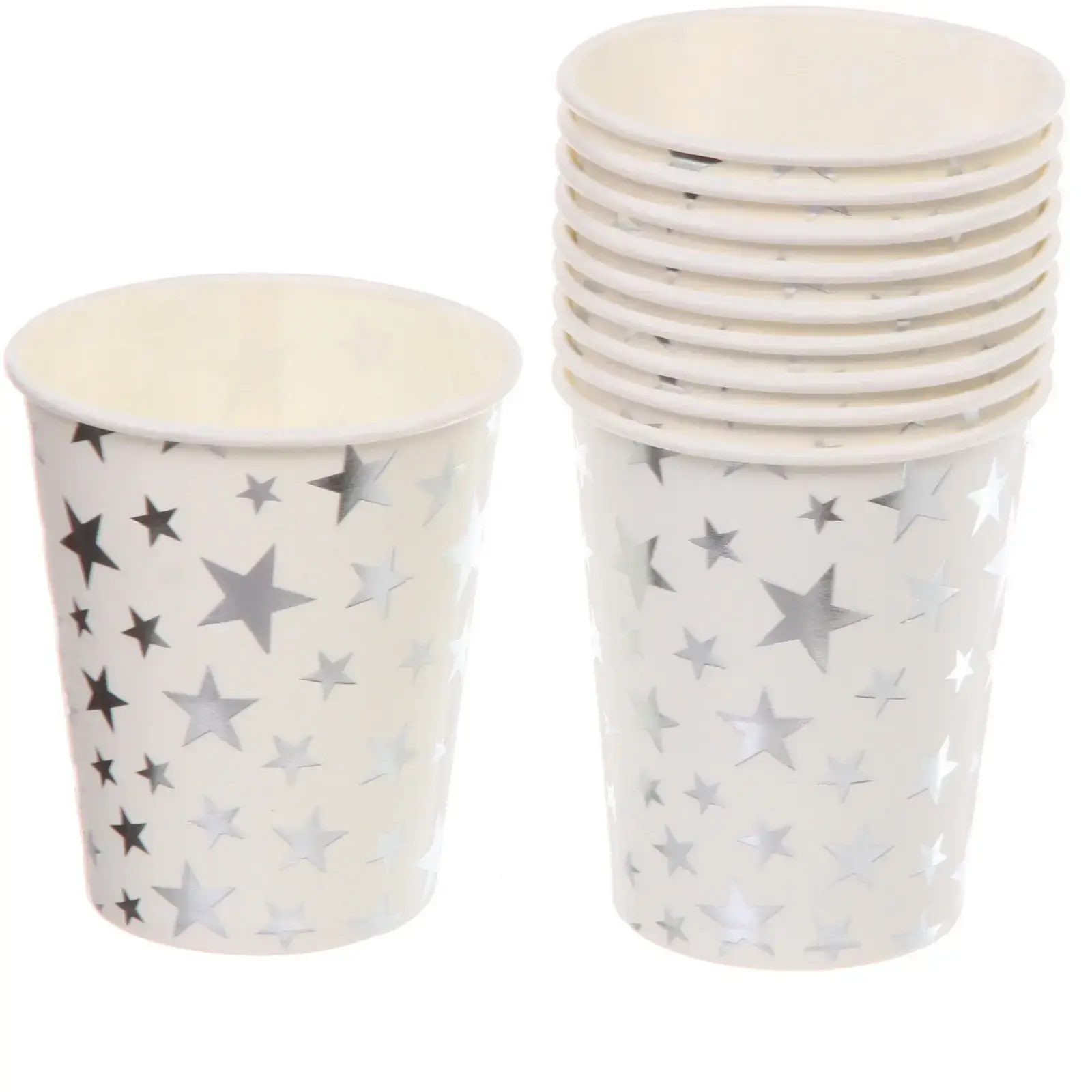 В наборе вы получите 10 стаканов, каждый из которых украшен серебристыми звездами на белом фоне. Стаканы имеют цилиндрическую форму и открытый верх, что обеспечивает удобство при использовании. Они идеально подходят для подачи холодных и горячих напитков. Размер стаканов стандартный, что делает их универсальными для любых напитков.