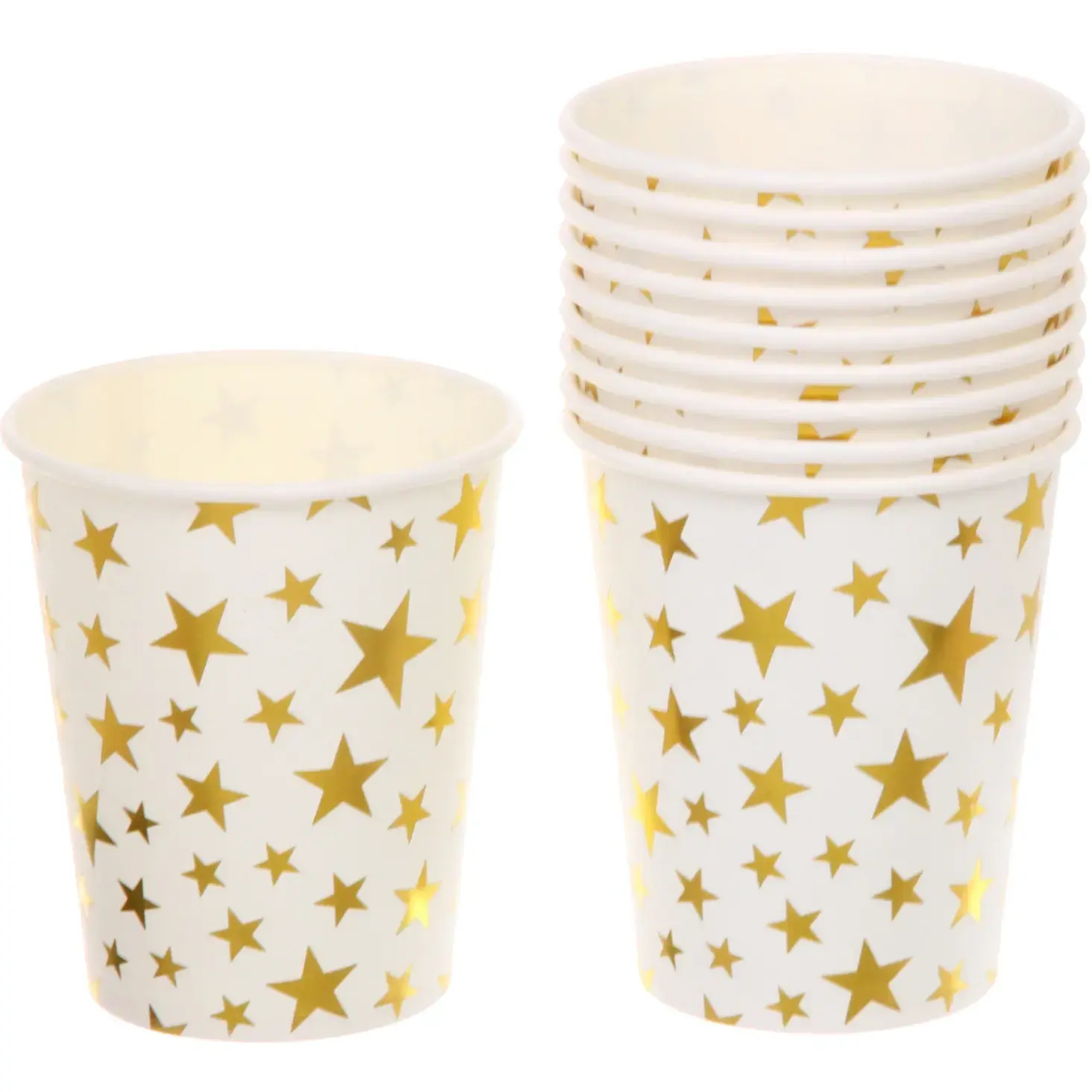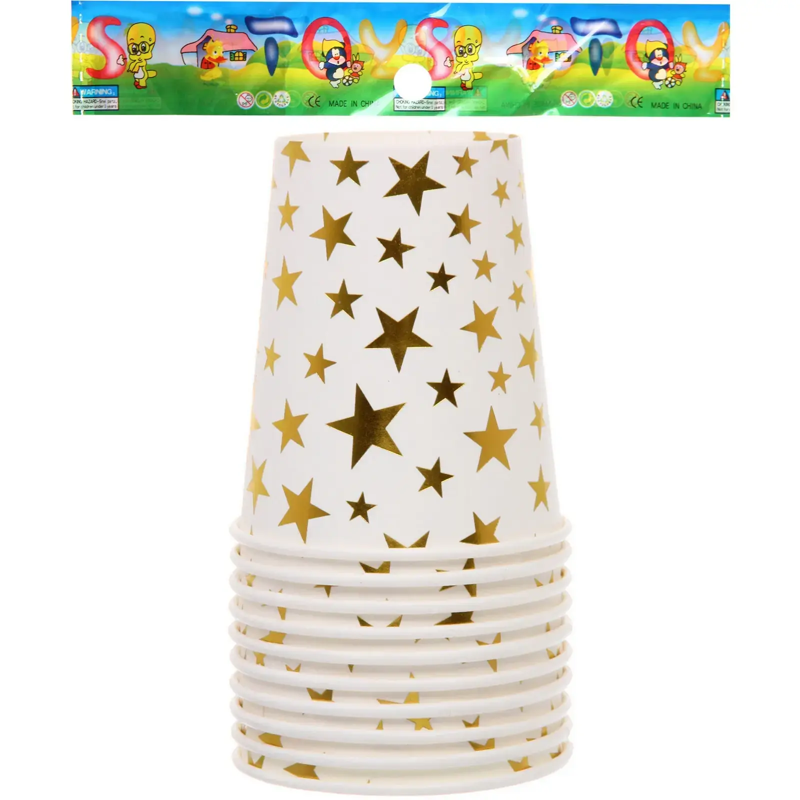 Стаканы имеют объем 0,2 литра, что делает их идеальными для подачи напитков, соков или коктейлей. Они подходят для детей и взрослых, а их яркий дизайн с золотыми звездами добавит изюминку в любое событие. Удобные в использовании, стаканы легко складываются и занимают мало места при хранении.