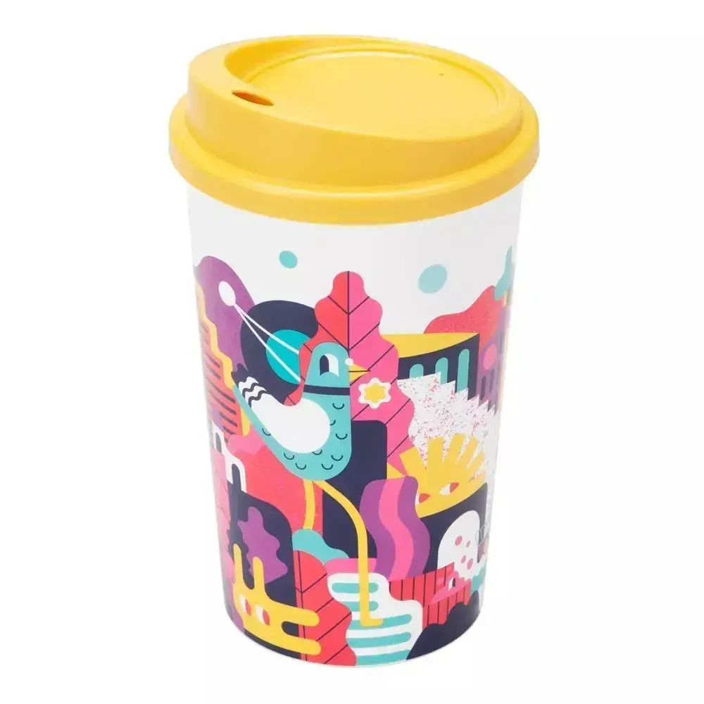 Объем 400 мл оптимален для стандартных порций. Белая основа стакана подчеркивает сочные цвета авторского рисунка с изображением колибри и абстрактными городскими элементами. Дизайнерская крышка желтого цвета добавляет стильный контраст.