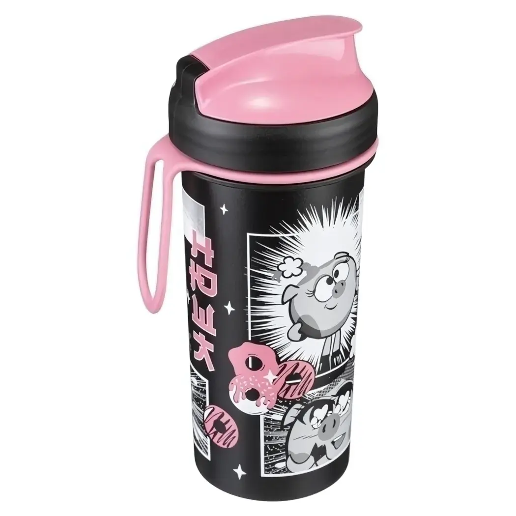 Стакан выполнен в черном цвете с яркими розовыми акцентами, что придает ему современный вид. Цилиндрическая форма и удобный механизм открывания делают его простым в использовании. Размеры стакана идеально подходят для захвата одной рукой, что делает его удобным для детей и взрослых.