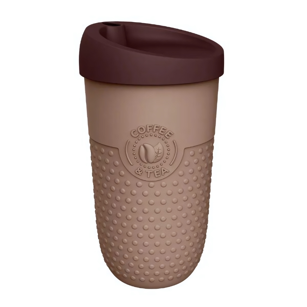 Корпус выполнен из пищевого полипропилена, пригодного для вторичной переработки. Нижняя часть украшена рельефным узором, который не только придает стильный внешний вид, но и улучшает сцепление с ладонью. Коричневый цвет и декоративная эмблема с кофейной тематикой создают атмосферу уютной кофейни.
