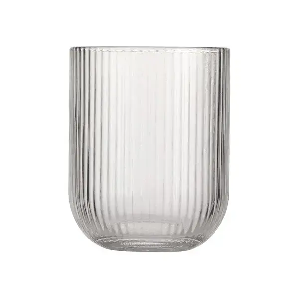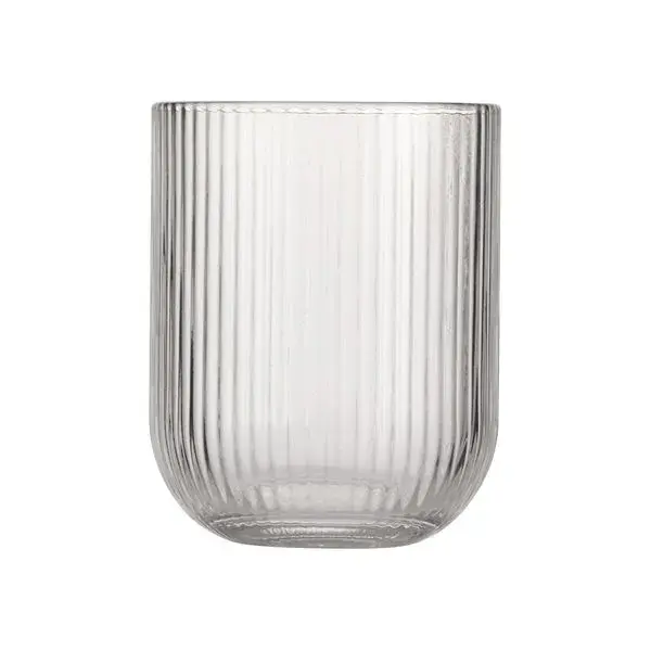 Стакан выполнен из прозрачного стекла (визуально определено), украшен вертикальными рифлёными полосами по всему объёму. Форма — цилиндрическая, с прямой верхней частью и слегка округлым дном. Размеры визуально соответствуют стандартному объёму 260 мл. Подходит для ежедневного использования и мытья вручную или в посудомоечной машине.