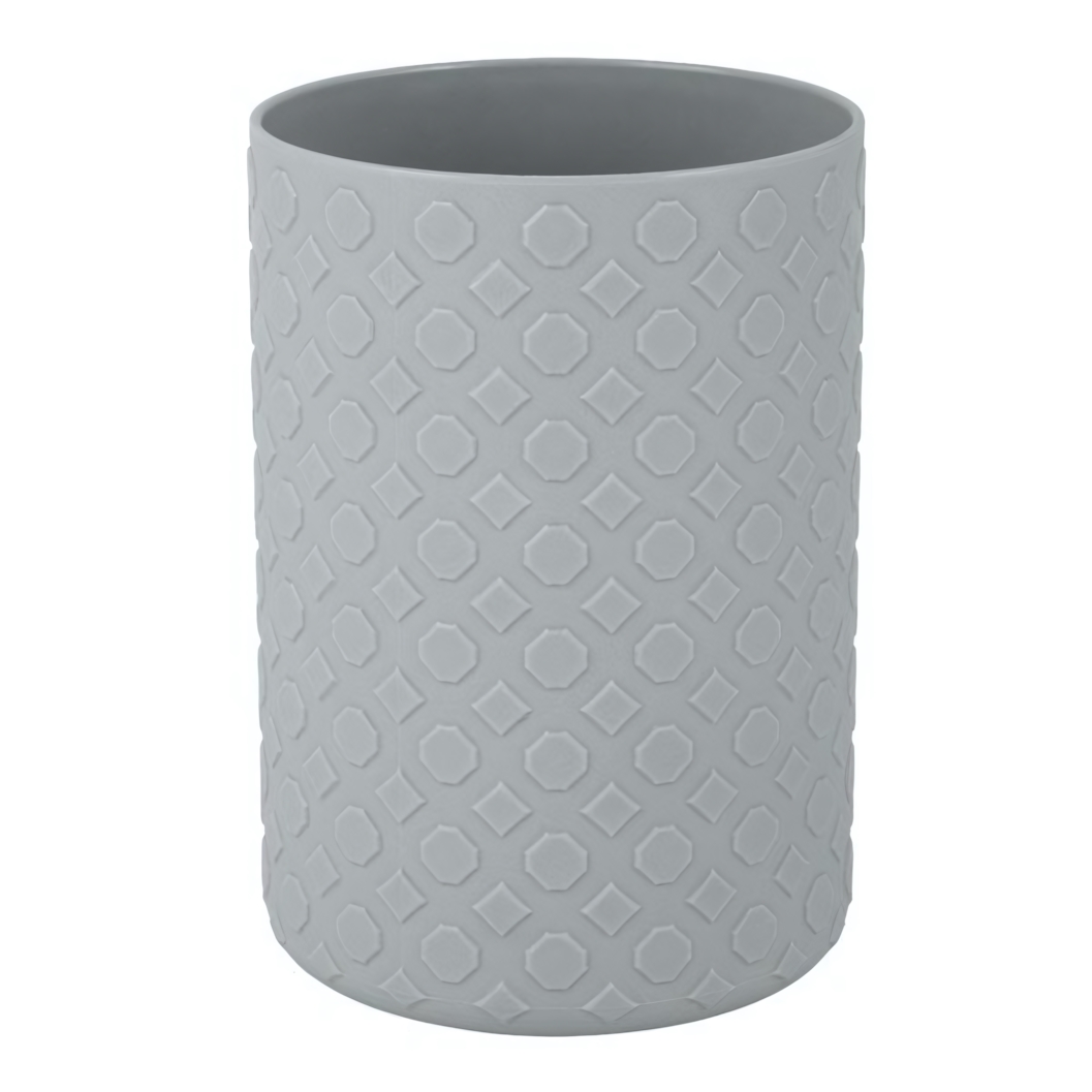 Изготовленный из безопасного пластика, стакан устойчив к воздействию влаги и прост в ежедневном уходе. Матовая поверхность и выразительная фактура с геометрическим рисунком добавляют интерьеру глубину и визуальный интерес, сохраняя при этом сдержанный стиль.