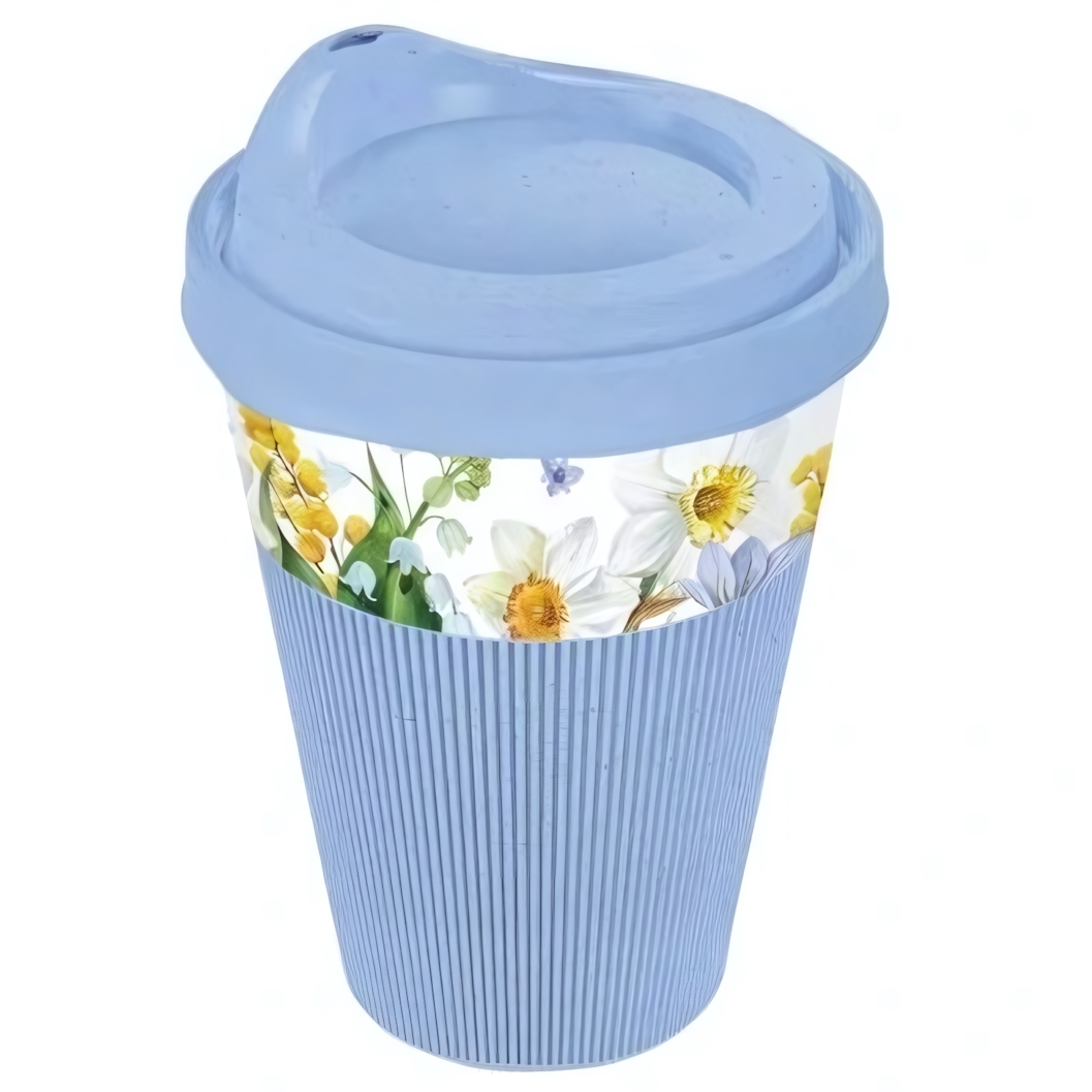 Корпус выполнен из прочного пластика, устойчивого к повседневному использованию. Голубая крышка и рельефная основа гармонично сочетаются с цветочным декором в верхней части. Такой стакан станет не только функциональной посудой, но и приятным аксессуаром для кухни или рабочего стола.