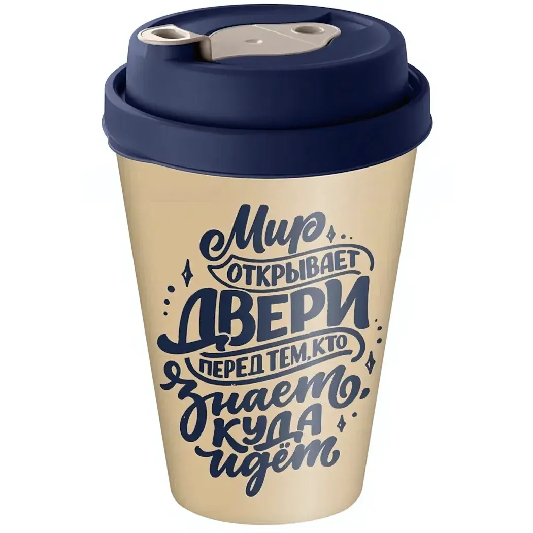 Подходит для холодных и горячих напитков: кофе, чая, смузи и лимонадов. Легко моется вручную и посудомоечной машине. Декоративная надпись «Мир открывает двери...» создает мотивационный акцент в повседневной рутине.