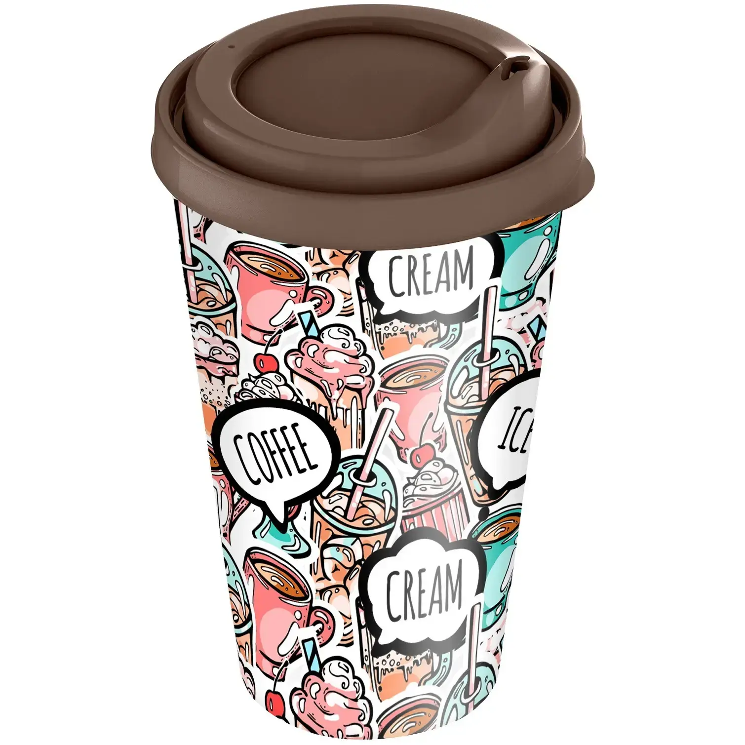 Стакан выполнен из прочного пластика, что обеспечивает его долговечность и устойчивость к повреждениям. Темно-коричневая крышка с отверстием для питья добавляет стильный акцент, а яркий принт на корпусе делает его привлекательным для глаз. Размер стакана идеально подходит для подачи как горячих, так и холодных напитков, что делает его универсальным аксессуаром для любого случая.