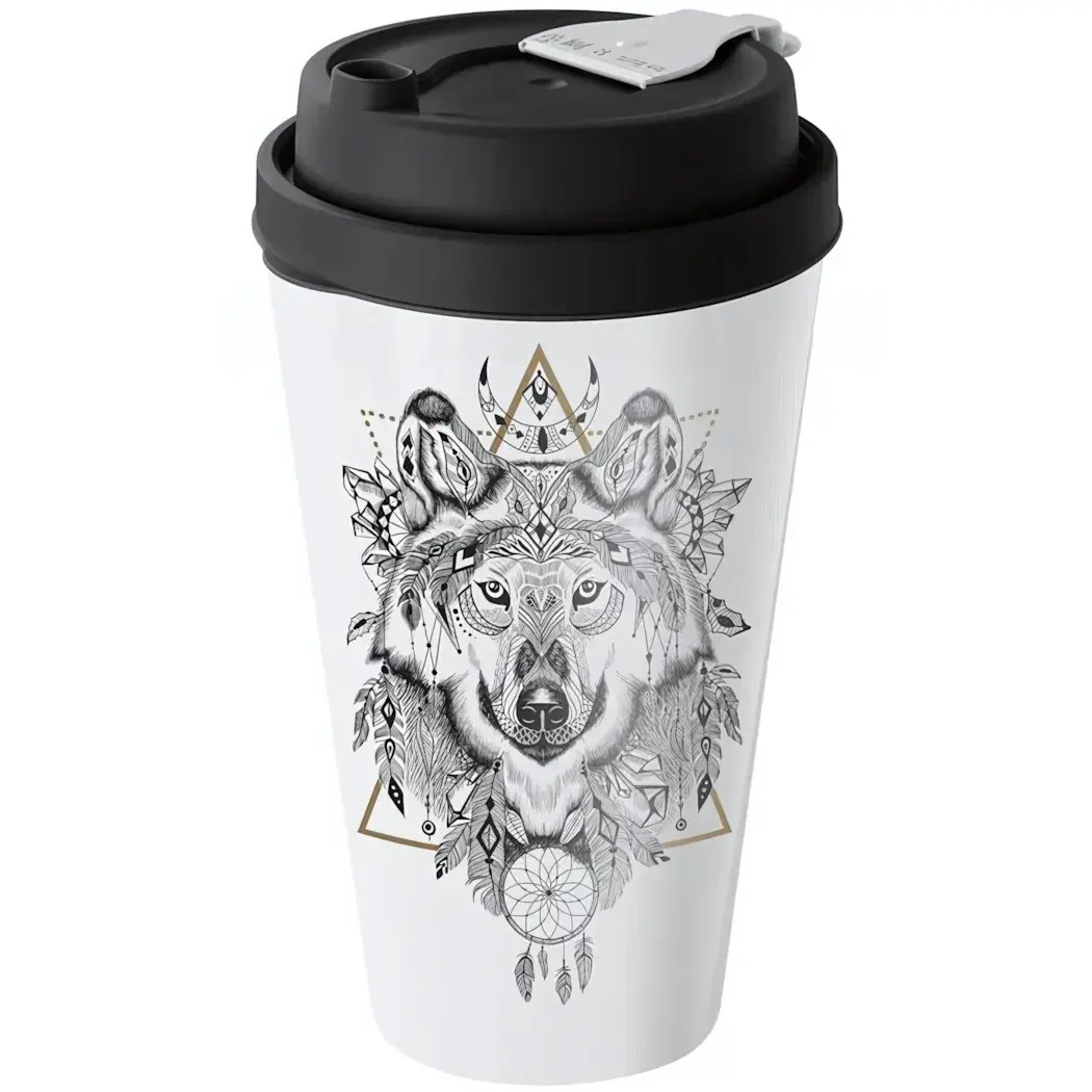 Сохраняйте температуру кофе или чая дольше благодаря герметичной крышке с клапаном. Стильный дизайн с геометрическим рисунком волка подчеркнёт вашу индивидуальность даже в дороге.