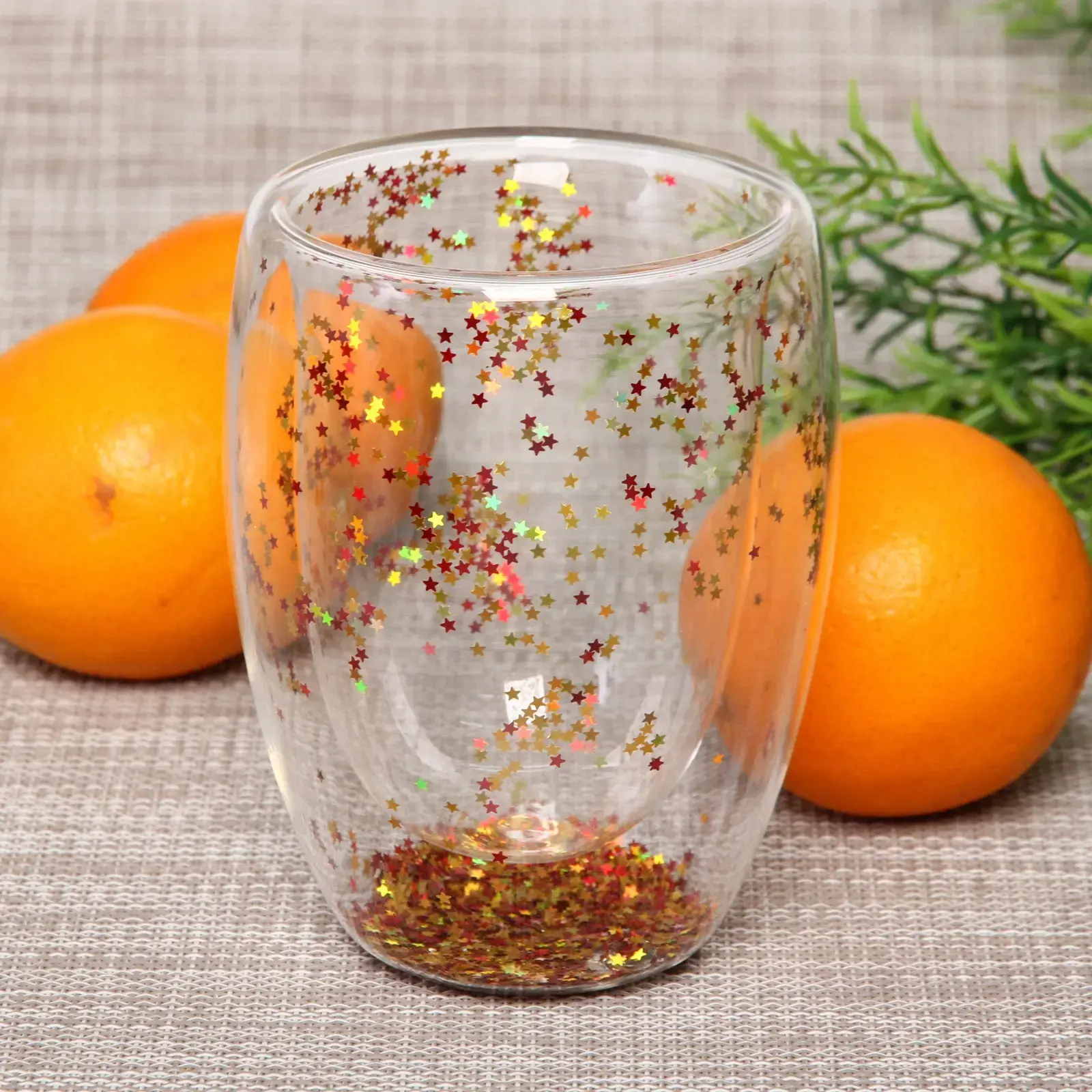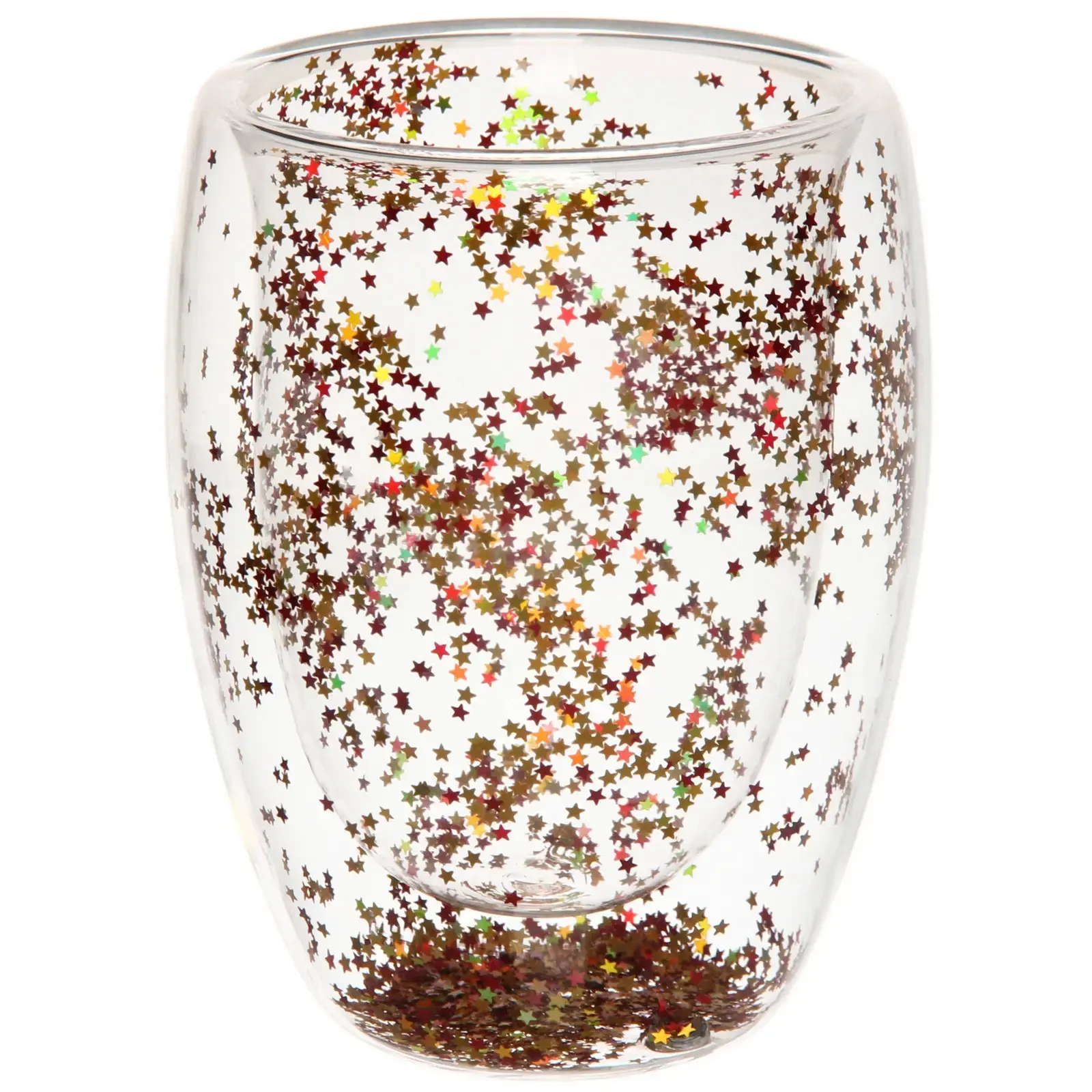 Стакан имеет овальную форму и гладкую поверхность, что делает его удобным в использовании. Прозрачный цвет позволяет видеть напиток внутри, а блестки создают эффект мерцания, привлекая внимание. Размер стакана идеально подходит для повседневного использования, а также для особых случаев.