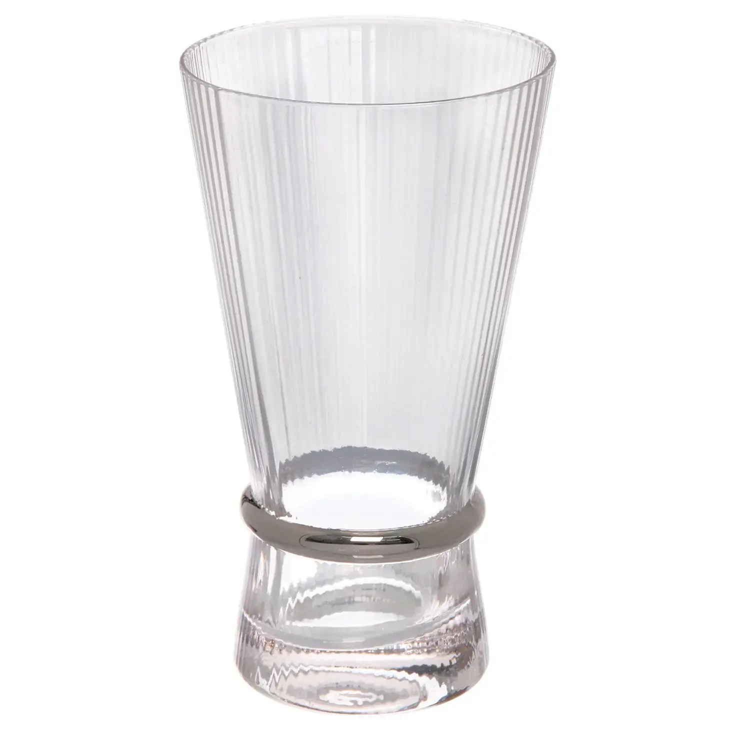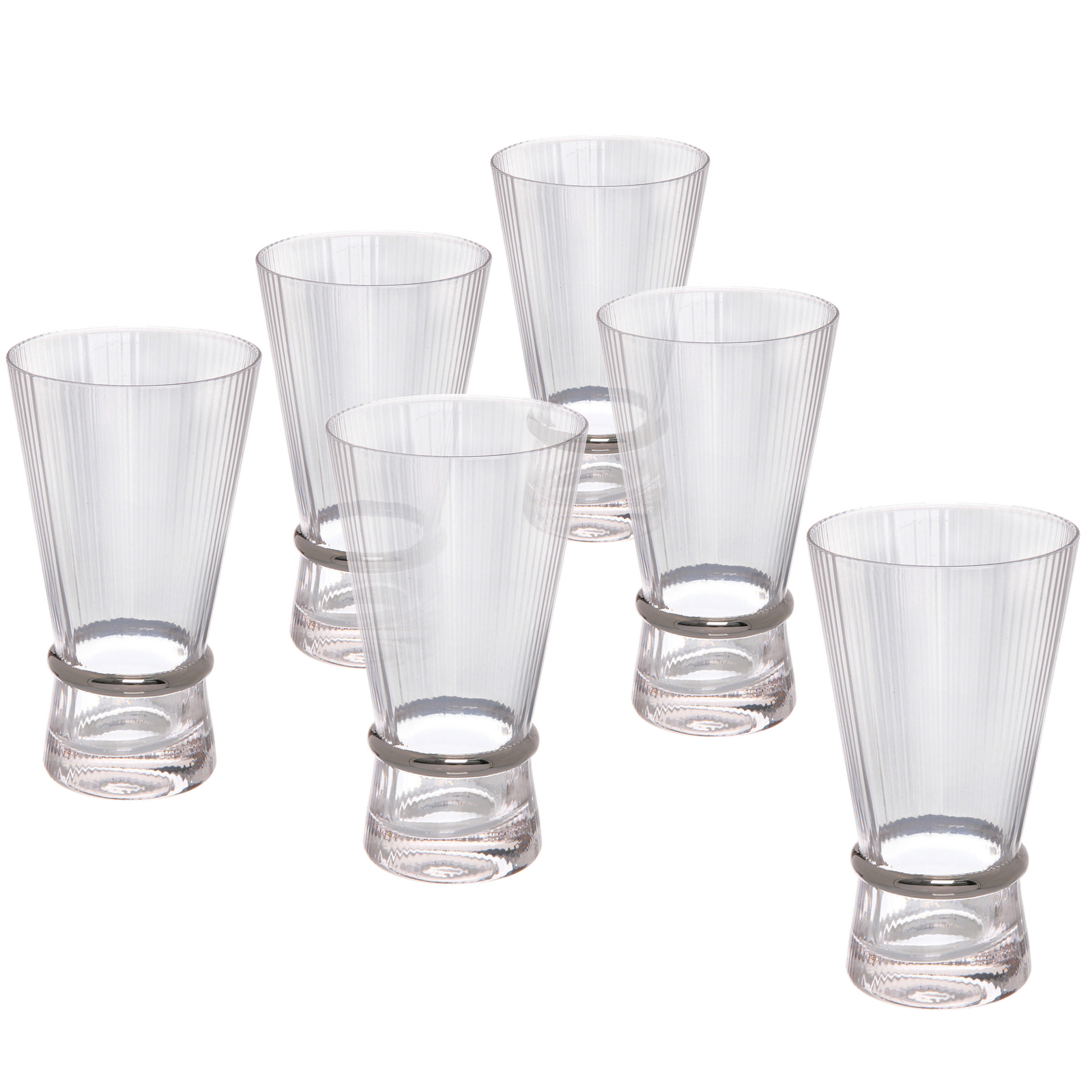 Набор из 6 прозрачных стаканов сочетает функциональность и стильный дизайн. Рифленая текстура создаёт игру света, а серебристое кольцо у основания добавляет акцент современной эстетики.
