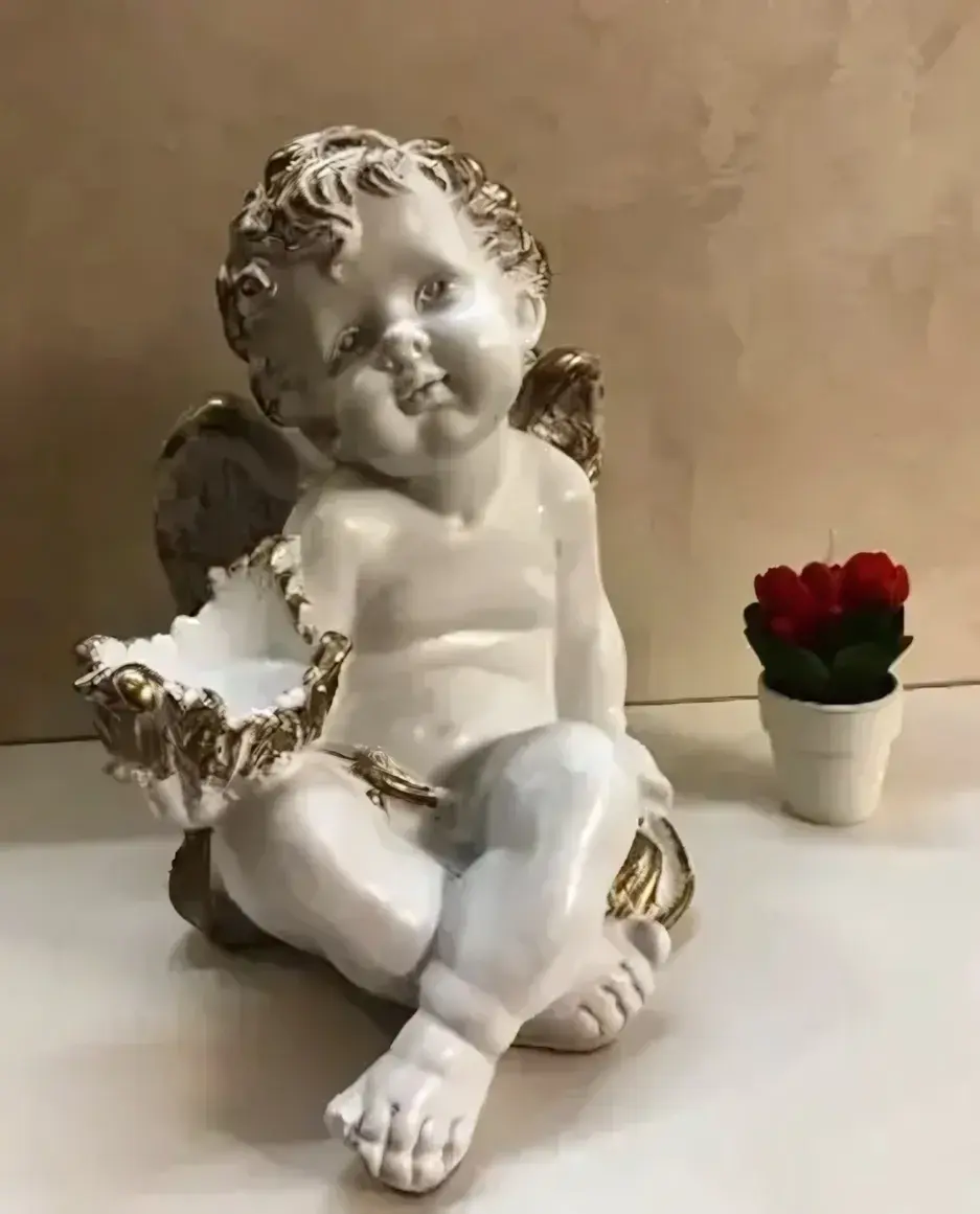 Статуэтка выполнена в белом и золотистом цветах, что делает её универсальной для любого стиля. Высота статуэтки составляет 30 см, что позволяет ей быть заметной, но не слишком громоздкой. Она изображает миловидного ангела с кудрявыми волосами и улыбкой, что добавляет ей очарования. В одной руке ангел держит чашу, также оформленную в золотистом цвете, что подчеркивает изящество изделия.