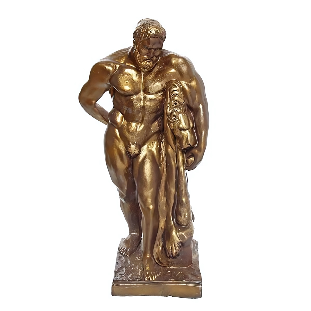 Статуэтка изображает Геракла в момент отдыха после одного из подвигов. В левой руке он держит шкуру Немейского льва, которую победил, а правой опирается. Композиция стоит на устойчивом прямоугольном основании. Благодаря лаконичному дизайну и нейтральному золотому цвету, она сочетается с классическими, современными и даже лофтовыми интерьерами.