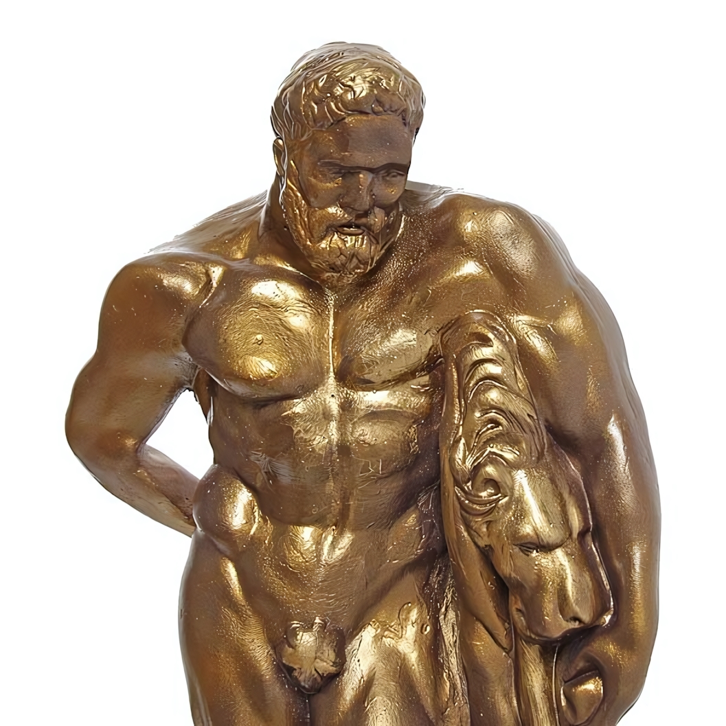 - Высокая детализация: фигура героя проработана с анатомической точностью, видны все мускулы, складки шкуры льва и черты лица.