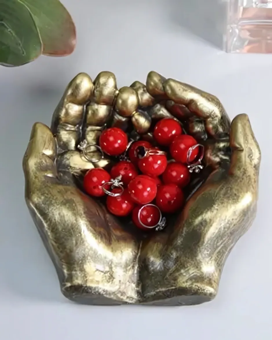 - Хранение украшений: кольца, серьги, браслеты, цепочки будут надежно лежать в чаше, образованной ладонями, и всегда оставаться на виду.