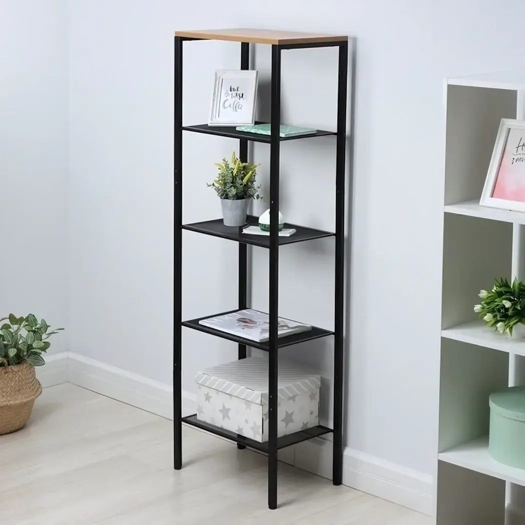 Стеллаж предназначен для хранения книг, декоративных элементов и других предметов, которые вы хотите разместить на виду. Он отлично подойдет для использования в гостиной, спальне или офисе. Благодаря пяти полкам, вы сможете удобно организовать свои вещи, а верхняя полка с деревянной поверхностью добавит тепла и уюта в ваш интерьер.