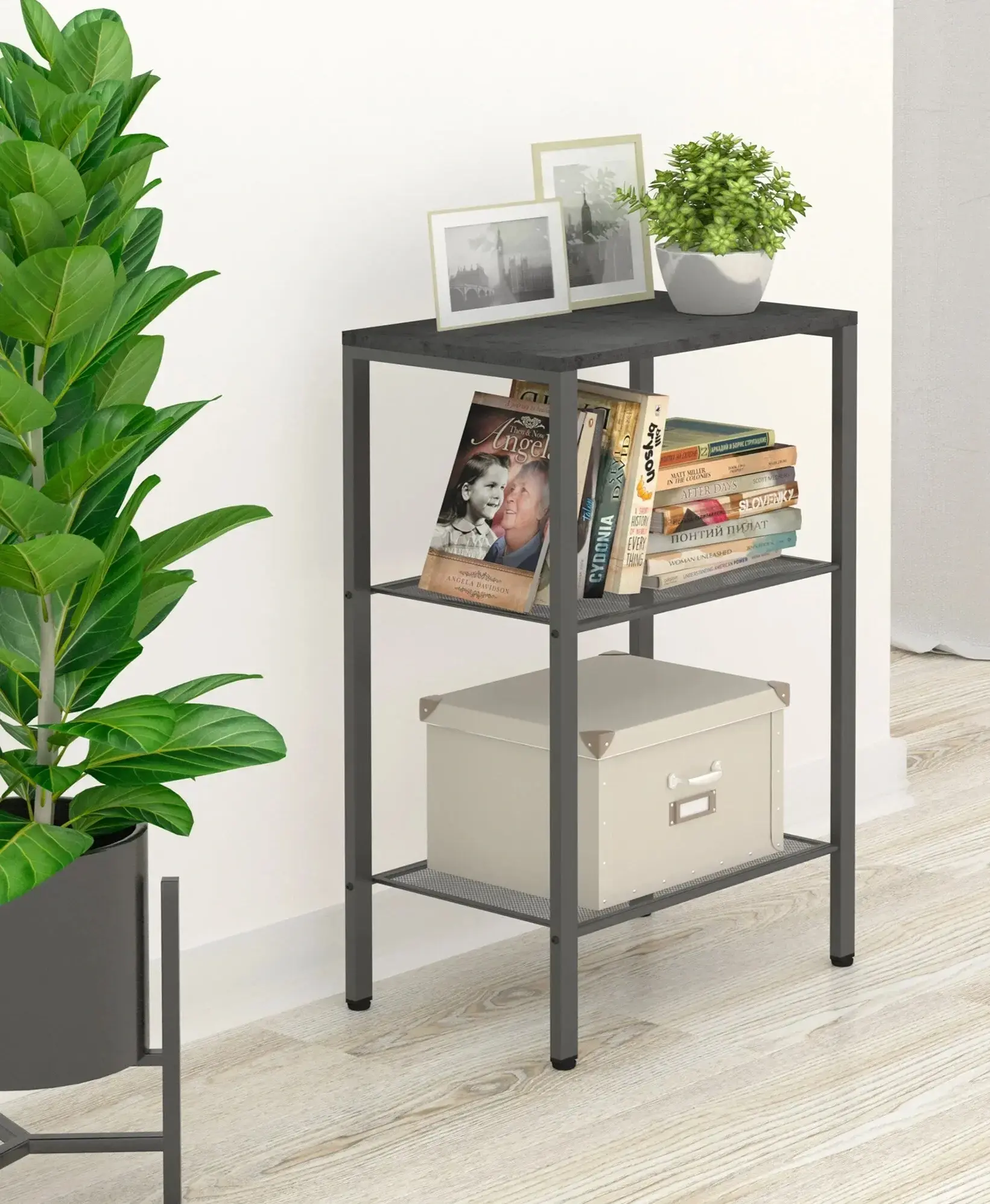 Стеллаж подходит для использования в различных помещениях: от гостиной до кабинета. Он легко вписывается в любой интерьер, благодаря своему лаконичному дизайну. На верхней полке можно разместить фоторамки и декоративные элементы, а на средних полках — книги и аксессуары. Нижняя полка идеально подходит для хранения коробок и других предметов, что позволяет поддерживать порядок.