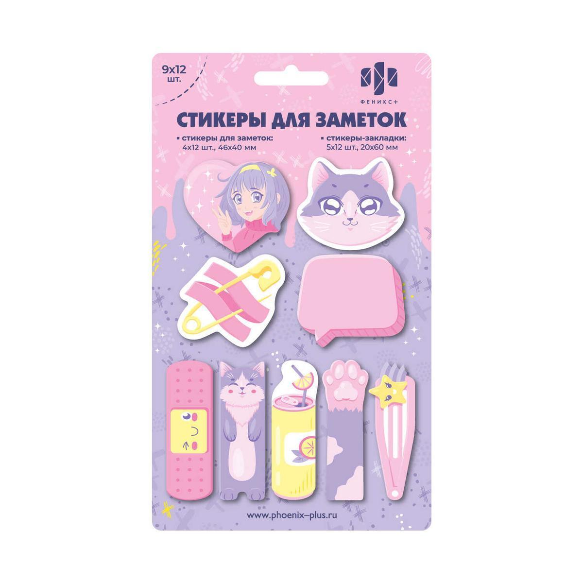 Стикеры-закладки бумажные «Коты», 108 шт., фигурные, 46х40 и 20х60 мм, жёлтый, розовый, фиолетовый
