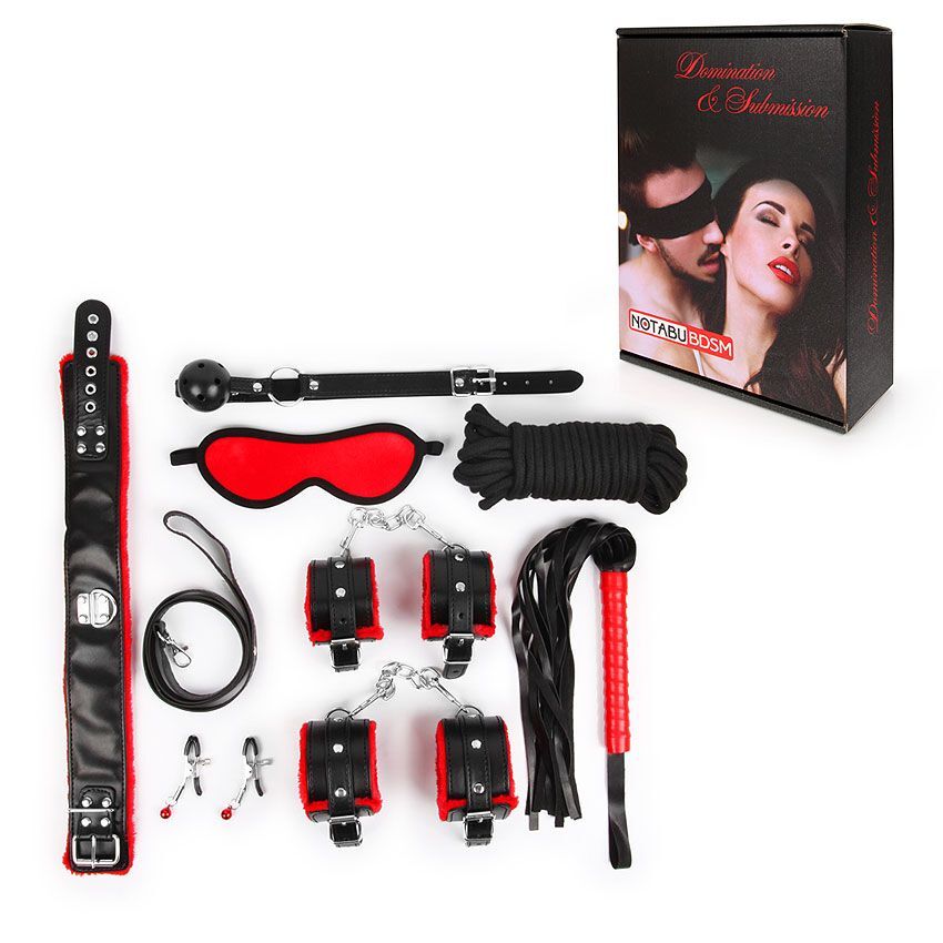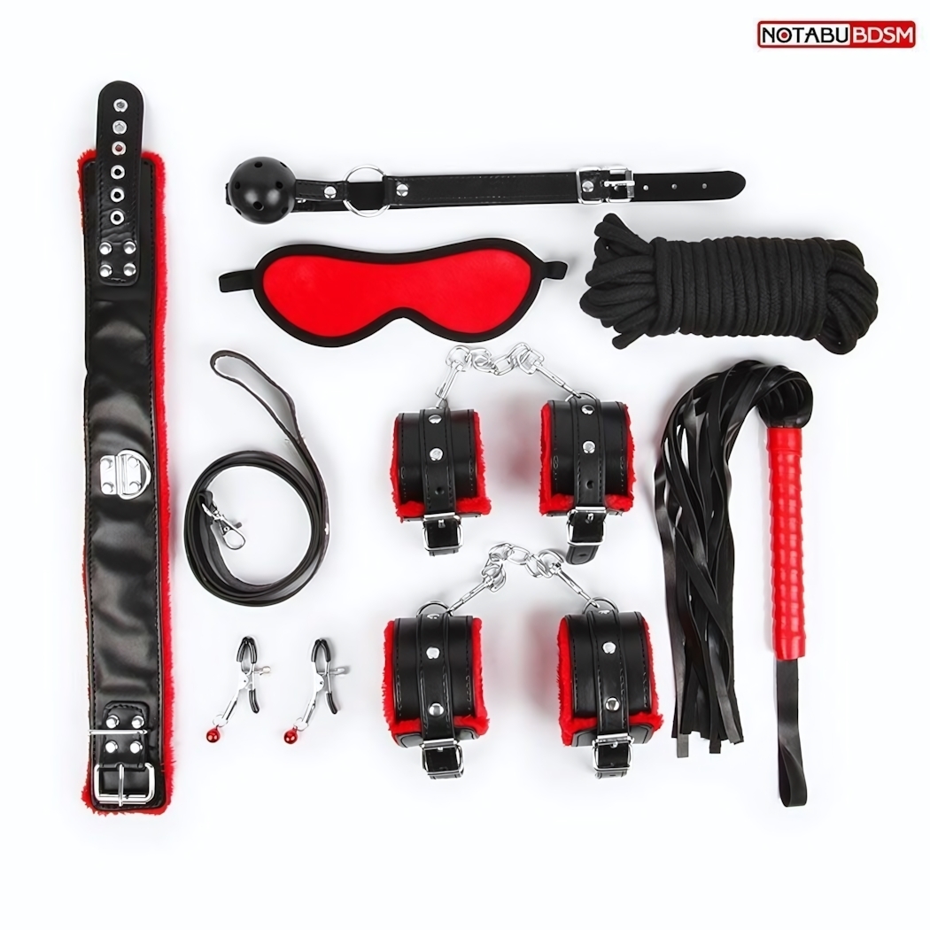 Этот специально подобранный набор для взрослых подойдет тем, кто ищет яркие эмоции, практичные и безопасные аксессуары для интимных игр и экспериментов. В комплект входят все необходимые элементы для создания комфортной и контролируемой атмосферы: наручники, оковы, ошейник, поводок, верёвка, кляп, маска, зажимы для сосков, плеть — все выполнено из качественного материала и украшено черным с красным дизайном, что придает им стильный вид и особую атмосферу.