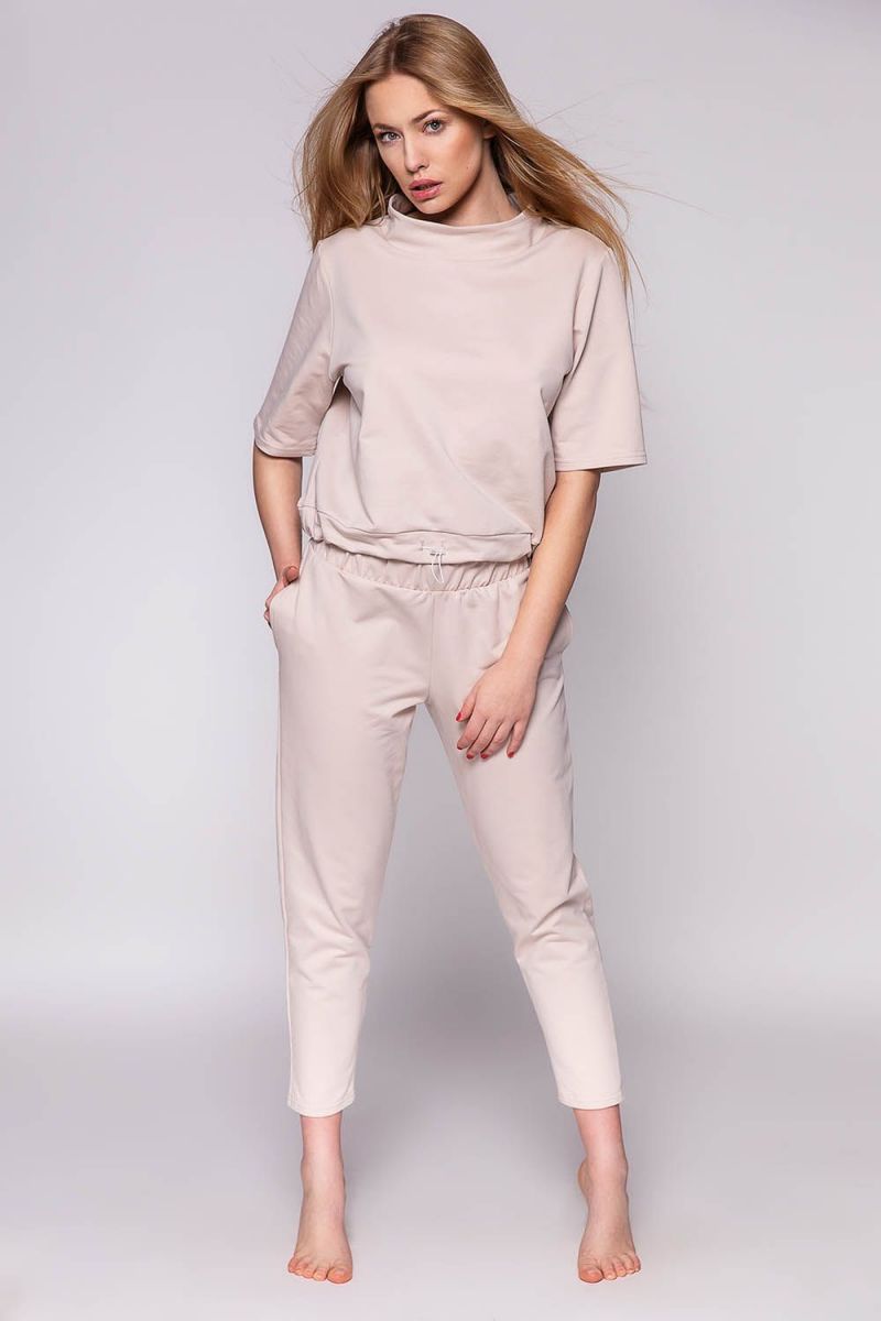 - Укороченные брюки зауженного кроя на широкой и мягкой резинке, которая не давит и не перетягивает талию. Наличие карманов добавляет практичности — в них можно положить телефон или небольшие предметы.