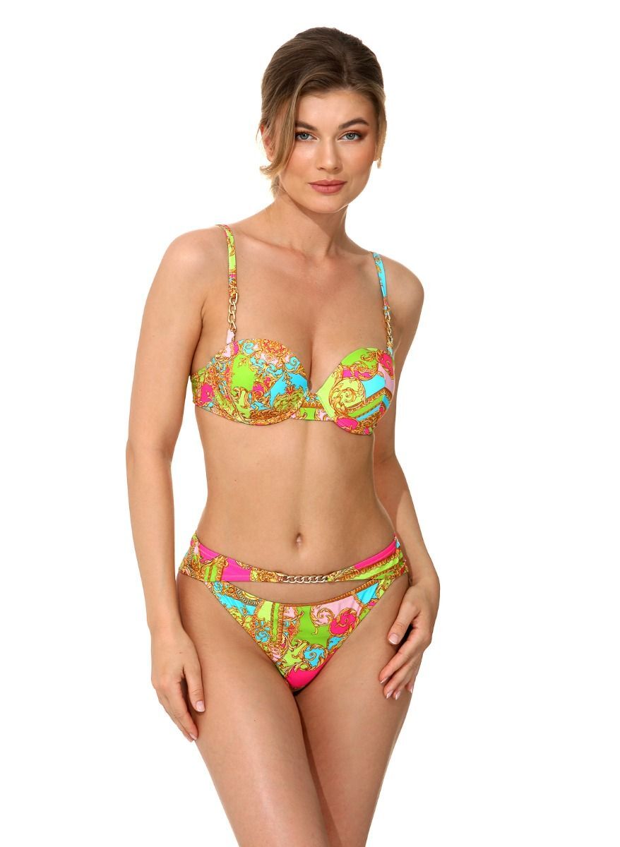 Погрузитесь в мир стиля и комфорта с нашим стильным купальником, который подчеркнет вашу индивидуальность и сделает вас центром внимания на любом пляже. Яркий разноцветный дизайн с цепочками на бретелях и пояске добавляет нотку игривости и элегантности, а гелевые чашки обеспечивают идеальную поддержку и комфорт.