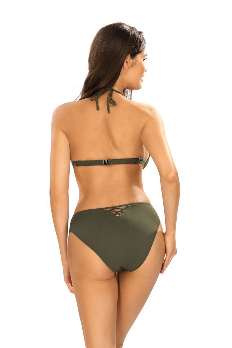 Купальник состоит из бюстгальтера с эластичными чашками, которые обеспечивают отличную поддержку и комфорт. Декоративная шнуровка между чашками добавляет изюминку, а тонкие бретельки, завязывающиеся на шее, позволяют регулировать посадку. На спине бретели также регулируются, что обеспечивает идеальную подгонку под вашу фигуру. Трусики-слип имеют посадку выше среднего и выполнены на стрейч-подкладке, что гарантирует удобство в носке.
