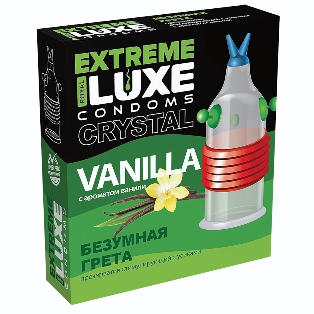 Презерватив стимулирующий «Безумная Грета» с ребрами и усиками, аромат ванили, латекс, прозрачный