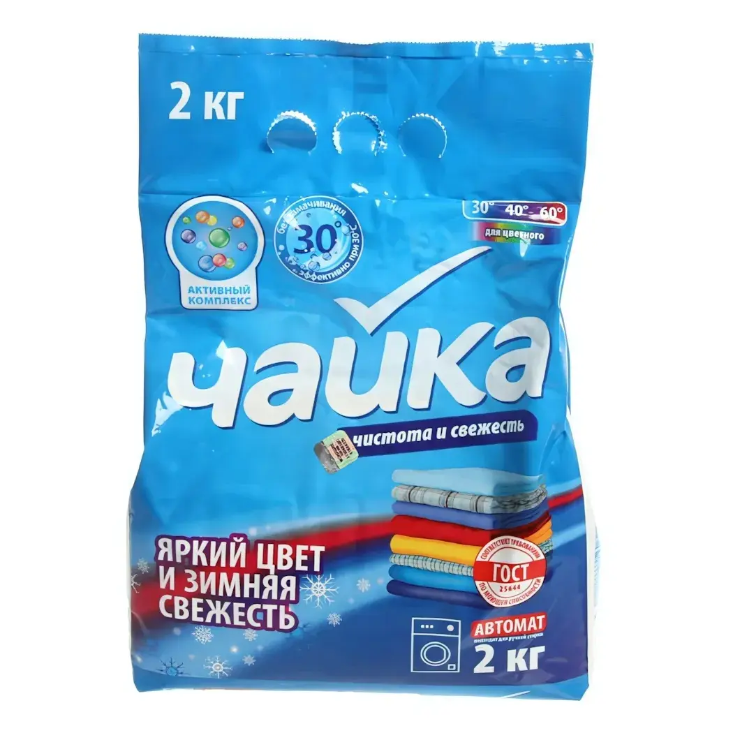 Упаковка порошка выполнена в ярком голубом цвете с белыми и красными элементами, что делает его заметным на полке. На упаковке указаны температурные режимы стирки, а также значок ГОСТ, что подтверждает высокое качество продукта. Порошок ЧАЙКА — это ваш надежный помощник в уходе за одеждой, который обеспечит чистоту и свежесть на долгое время.