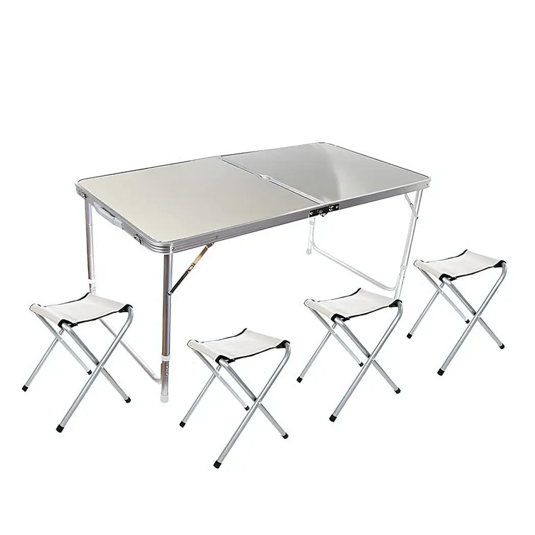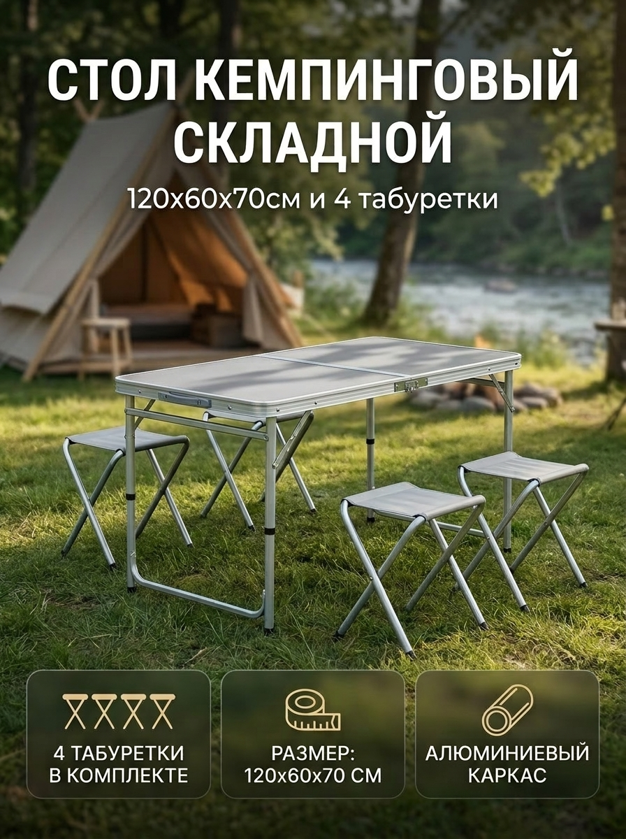 Не упустите возможность сделать ваши выезды на природу более комфортными и приятными с этим складным столом и табуретами!