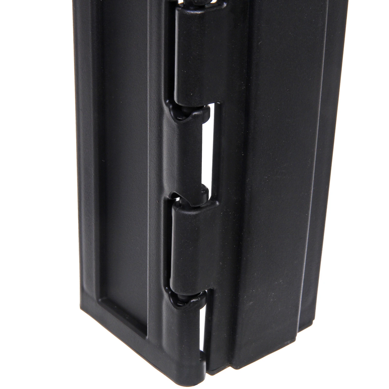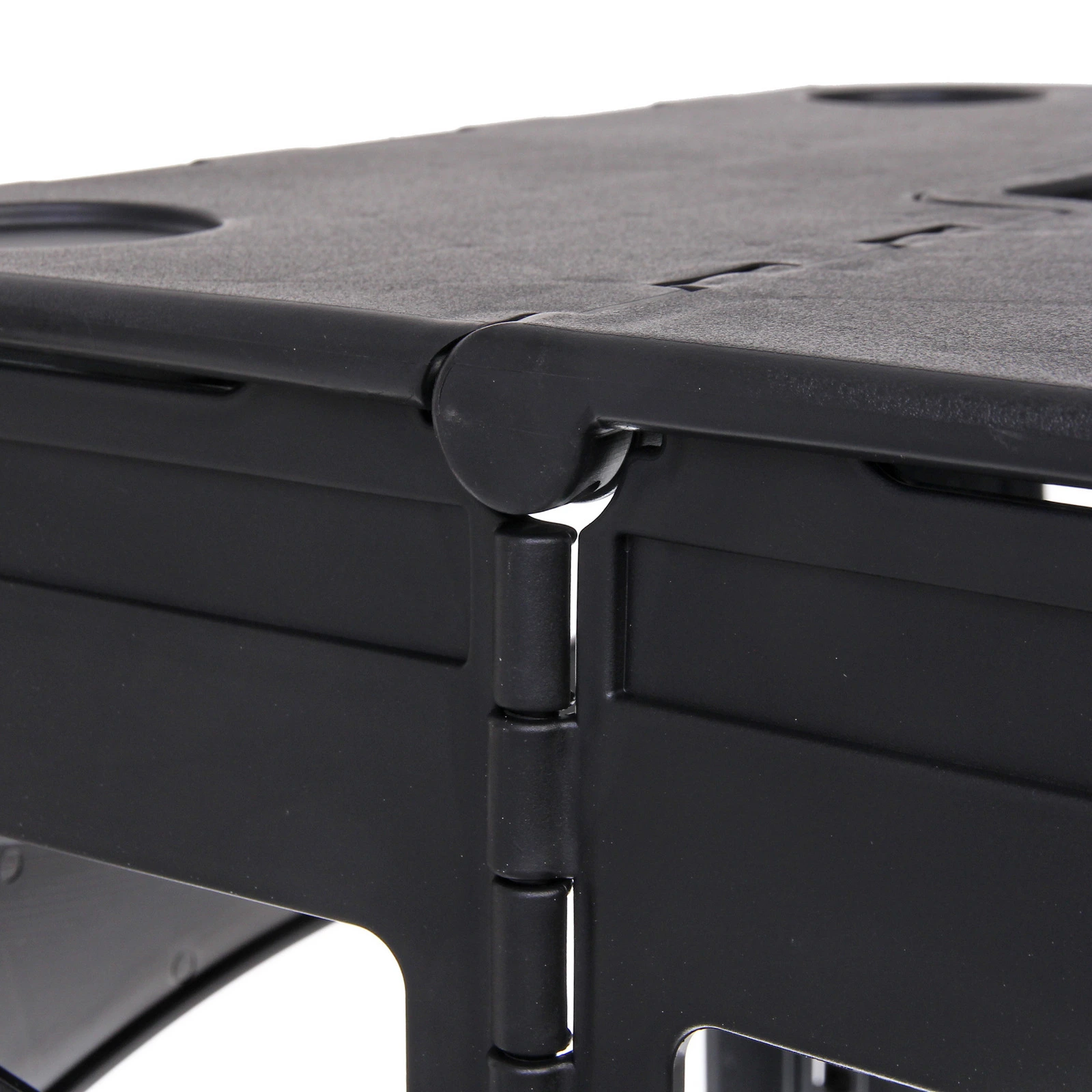 Столешница состоит из двух секций с центральной линией сгиба, что обеспечивает удобство складывания и дополнительную жесткость в разложенном виде. По углам расположены круглые углубления, которые можно использовать для устойчивого размещения посуды или мелких предметов. Черный цвет универсален и практичен — он гармонично впишется в любое туристическое снаряжение и менее маркий в условиях активного отдыха.