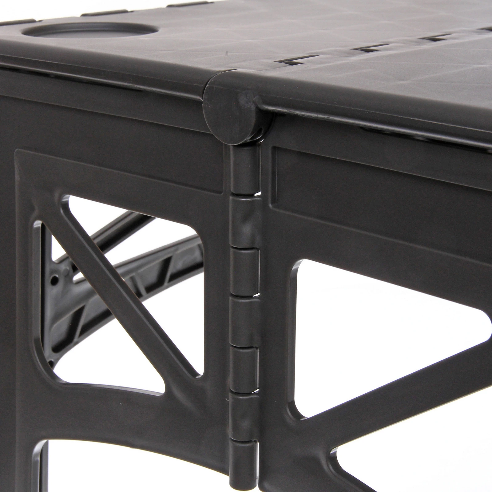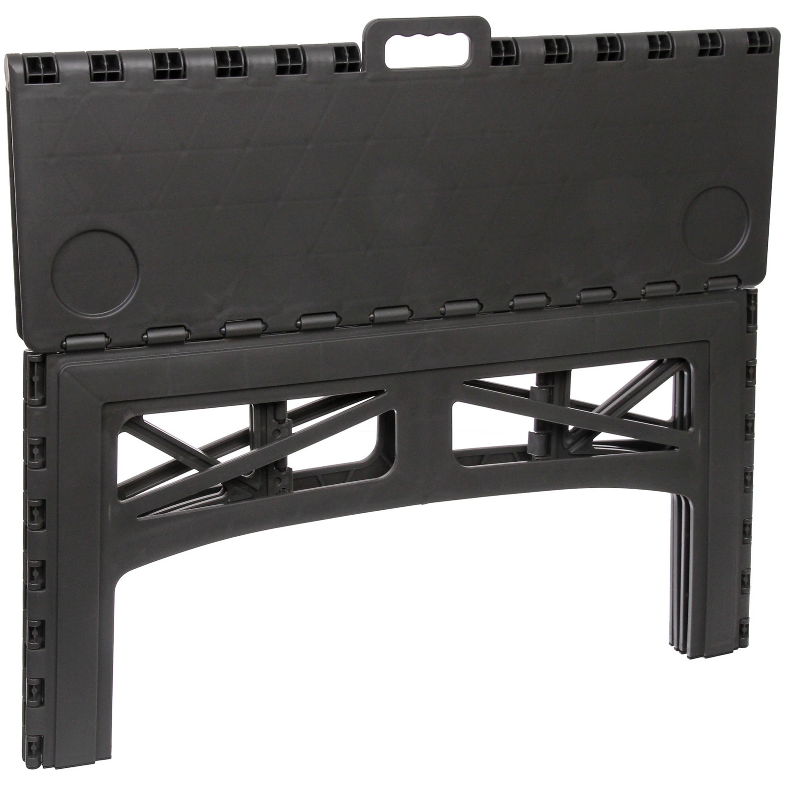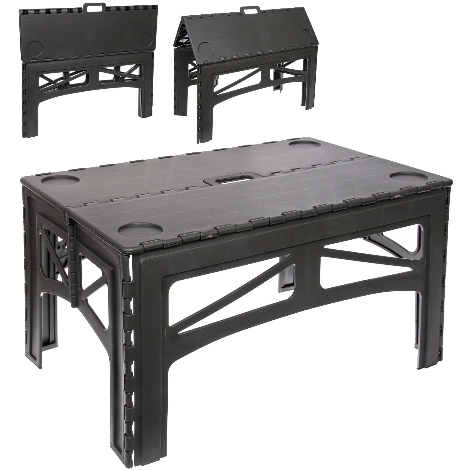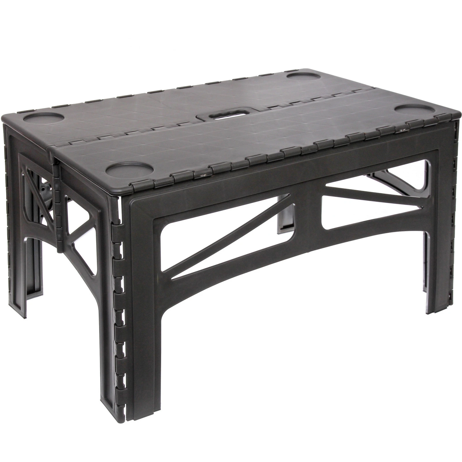 Столешница состоит из двух секций и легко складывается пополам, образуя компактный кейс с интегрированной ручкой. Благодаря этому стол удобно переносить и хранить в багажнике автомобиля. Устойчивая конструкция выдерживает нагрузку до 100 кг, что позволяет разместить посуду, продукты и необходимое снаряжение без риска деформации.