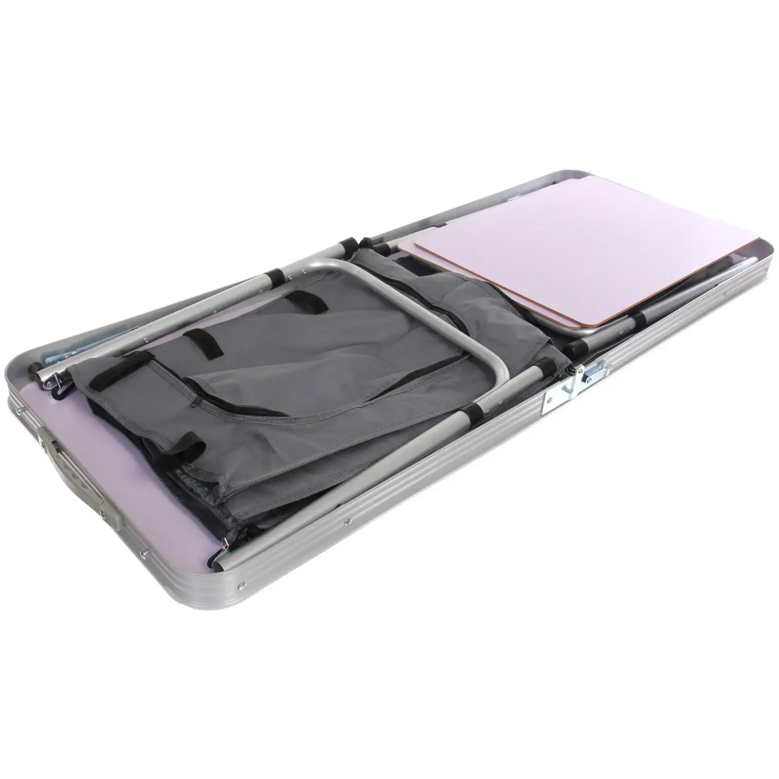 Размер в разложенном состоянии: 120x47 см. Вес — 3.8 кг. Механизм фиксации ножек предотвращает самопроизвольное складывание. Встроенная ручка на торце обеспечивает удобную переноску.