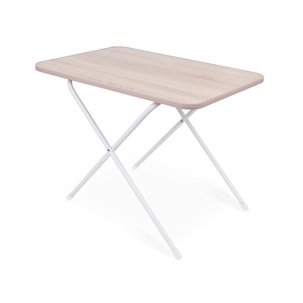 Этот стол выполнен из качественных материалов: столешница из дерева и металлические ноги, окрашенные в белый цвет, обеспечивают надежность и долговечность. Пластиковые опоры на ножках добавляют устойчивости, что позволяет использовать стол даже на неровных поверхностях. Максимальная нагрузка на стол составляет до 50 кг, что делает его подходящим для различных задач.