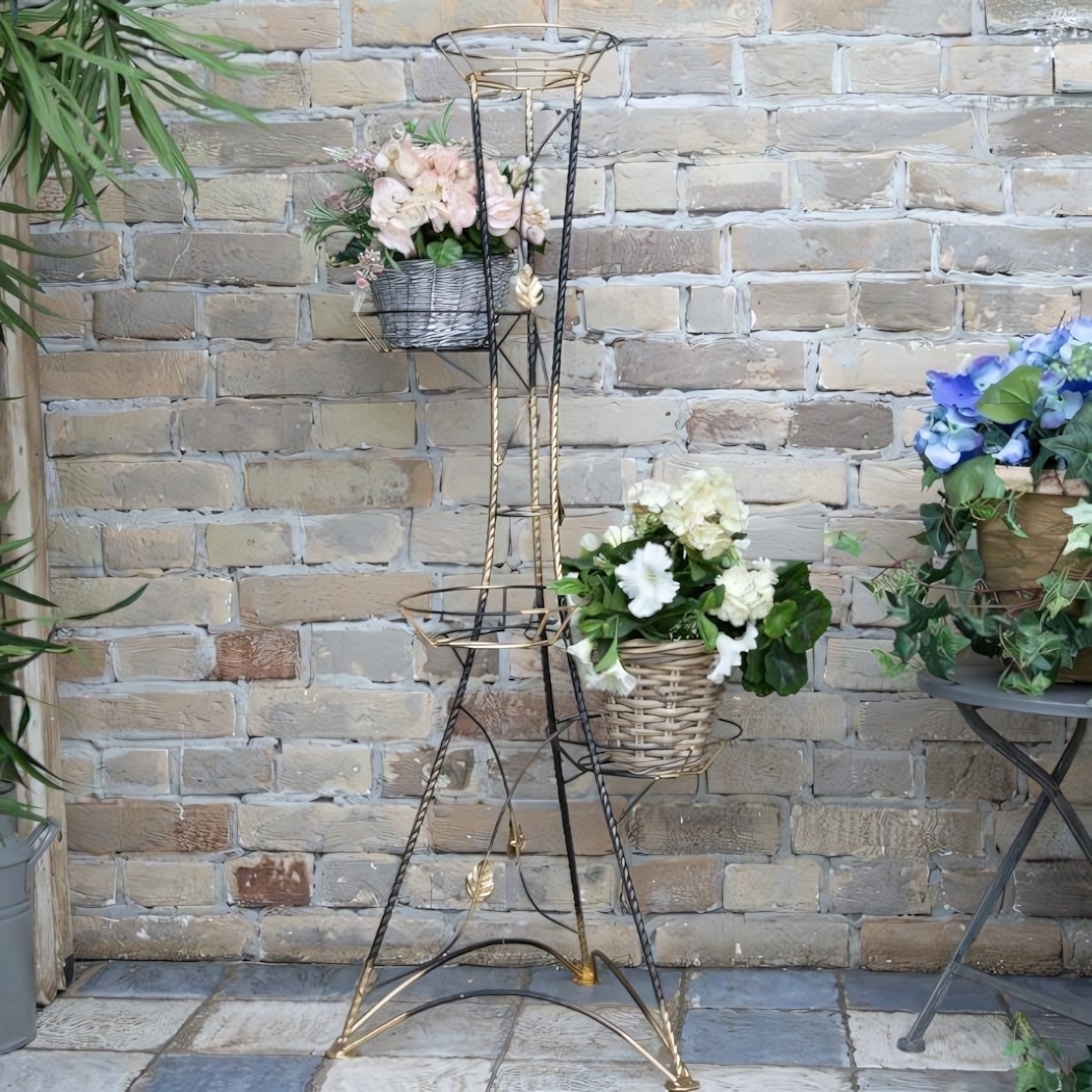 Стойка имеет черный и золотой цвет, что делает ее универсальной для различных стилей оформления. Она отлично подойдет как для домашних условий, так и для офисов или кафе. Размеры корзинок позволяют разместить как небольшие цветы, так и более крупные растения, что делает ее практичным решением для любого любителя флоры.