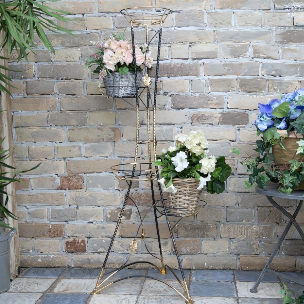 Стойка оснащена четырьмя держателями, расположенными на разной высоте. Три корзинки имеют посадочный размер 14,5 см, одна — 16,5 см, что позволяет комбинировать небольшие и средние горшки. Разная высота уровней помогает выгодно представить композицию из ампельных и классических растений.
