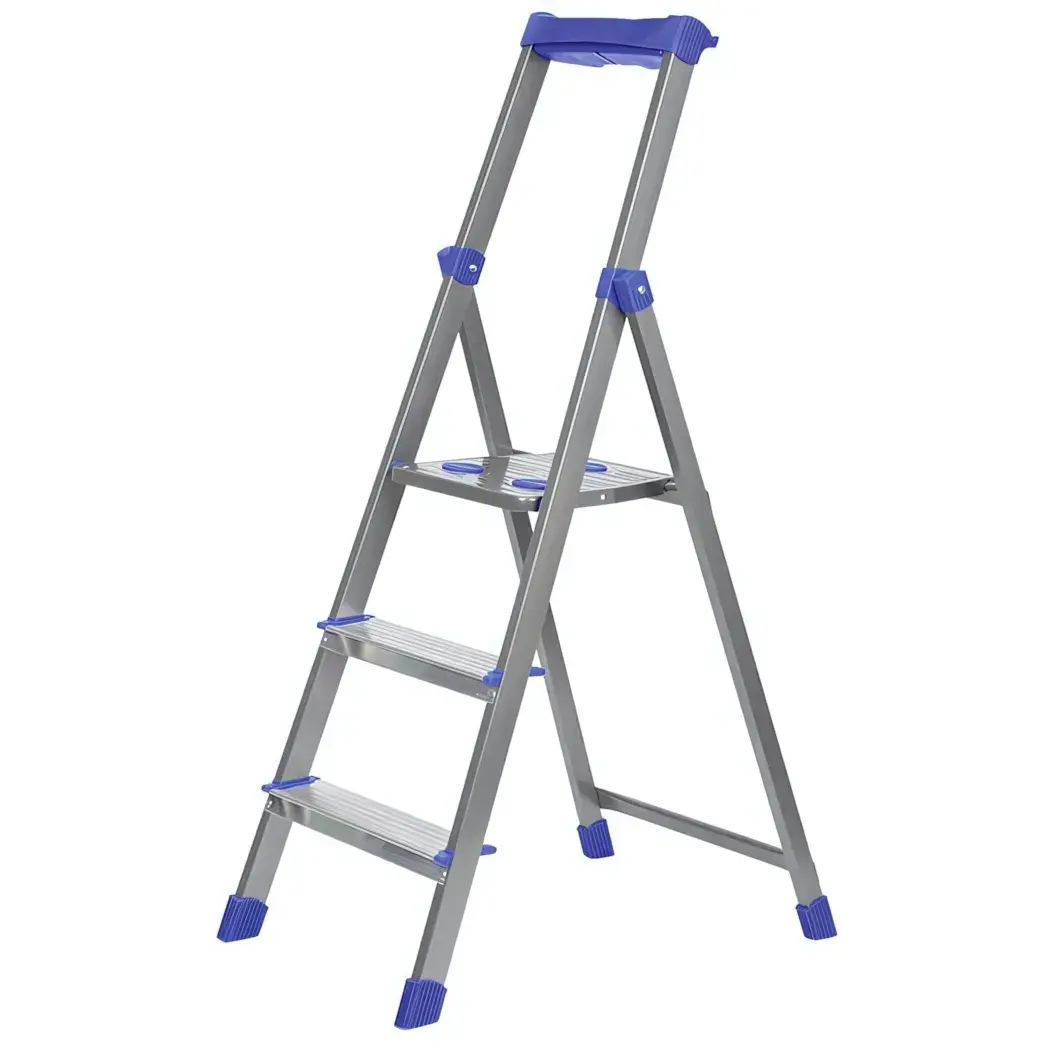 Стремянка выполнена из качественного металла, что гарантирует её прочность и долговечность. Цвет конструкции — серебристый с синими пластиковыми вставками, что придаёт ей стильный вид. Размеры и особенности конструкции делают её идеальной для использования в домашних условиях.