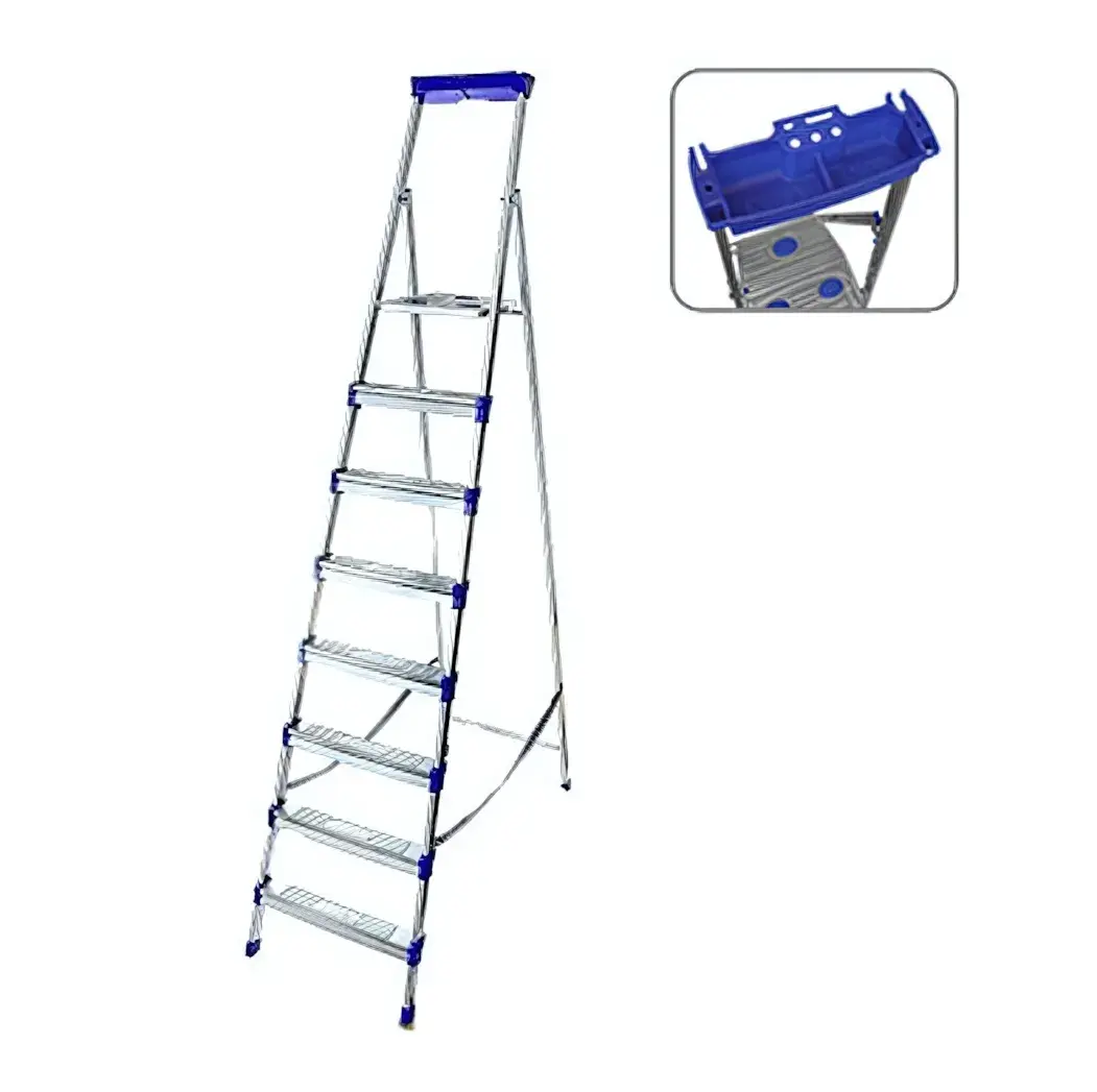 Стремянка выполнена из прочного металла с рифлеными ступенями, что обеспечивает отличное сцепление и предотвращает скольжение. Ярко-синие пластиковые элементы добавляют стильный акцент и делают использование стремянки более удобным. Верхняя площадка с углублениями позволяет разместить инструменты и материалы, что значительно экономит ваше время.