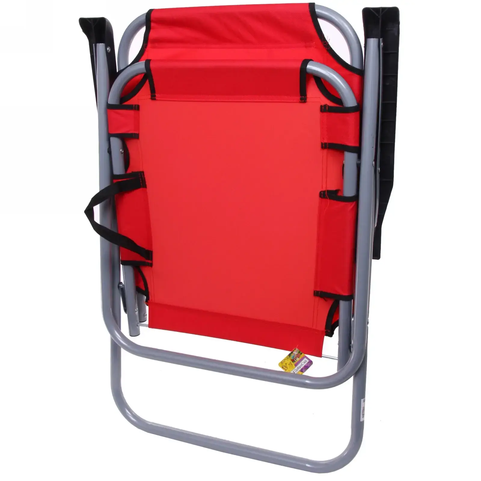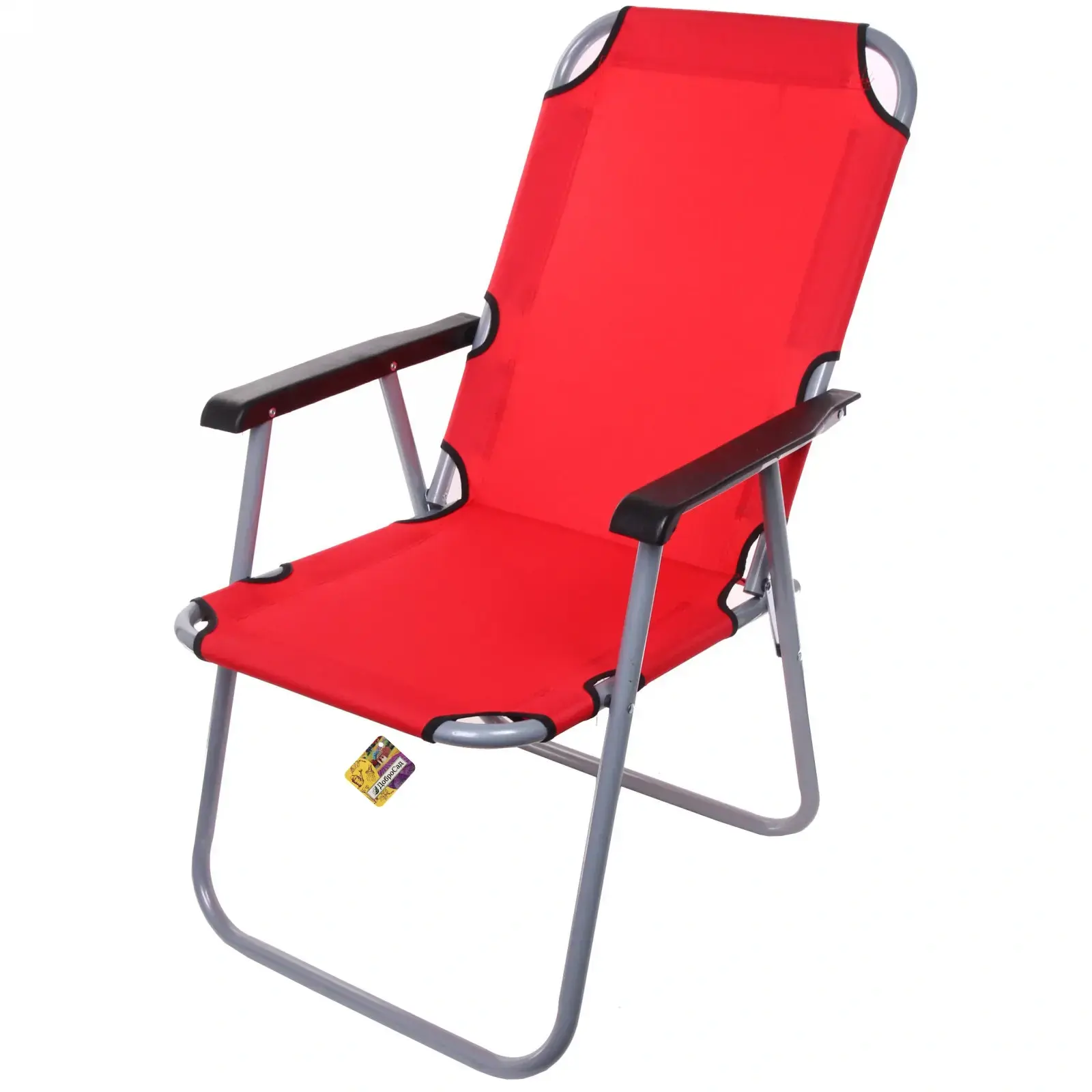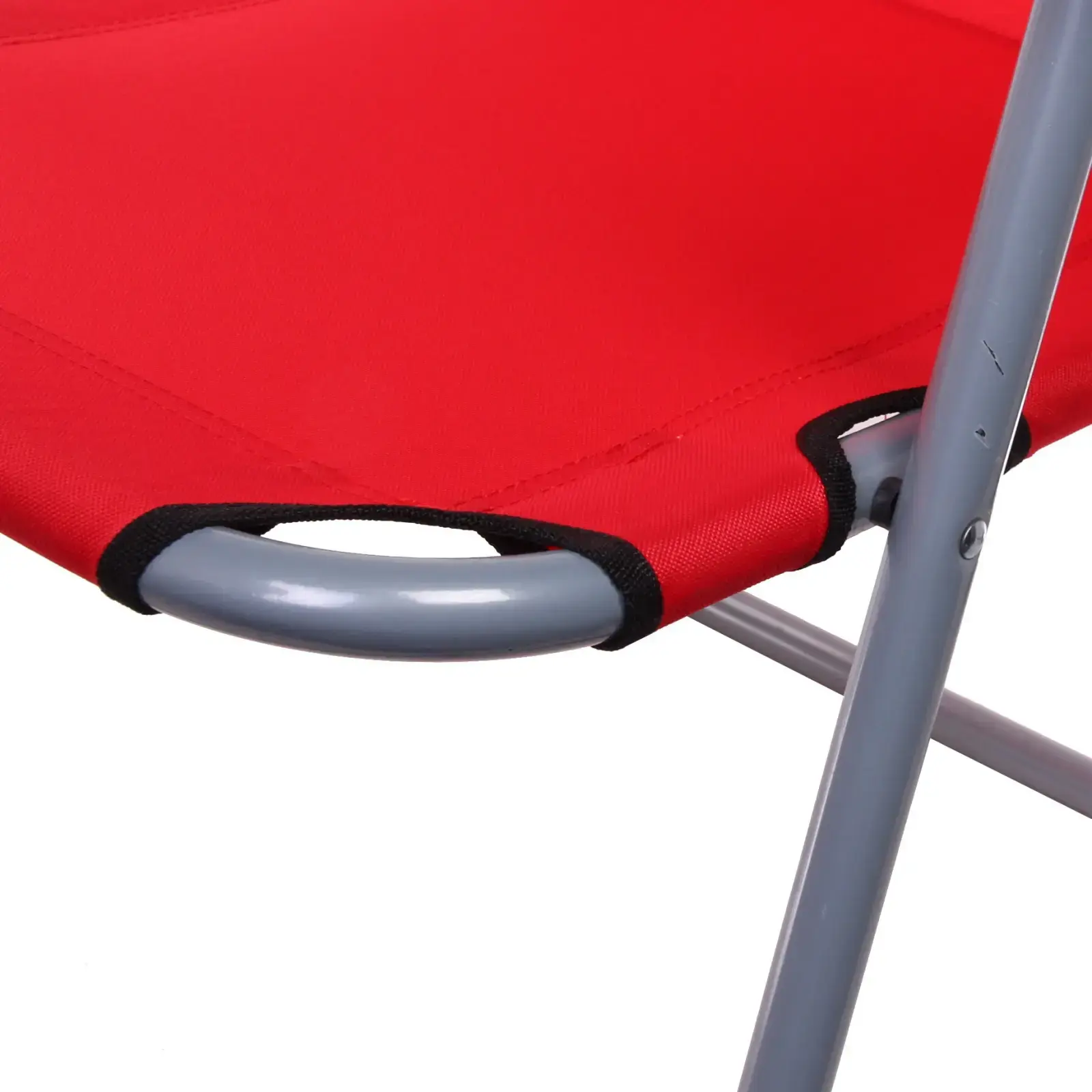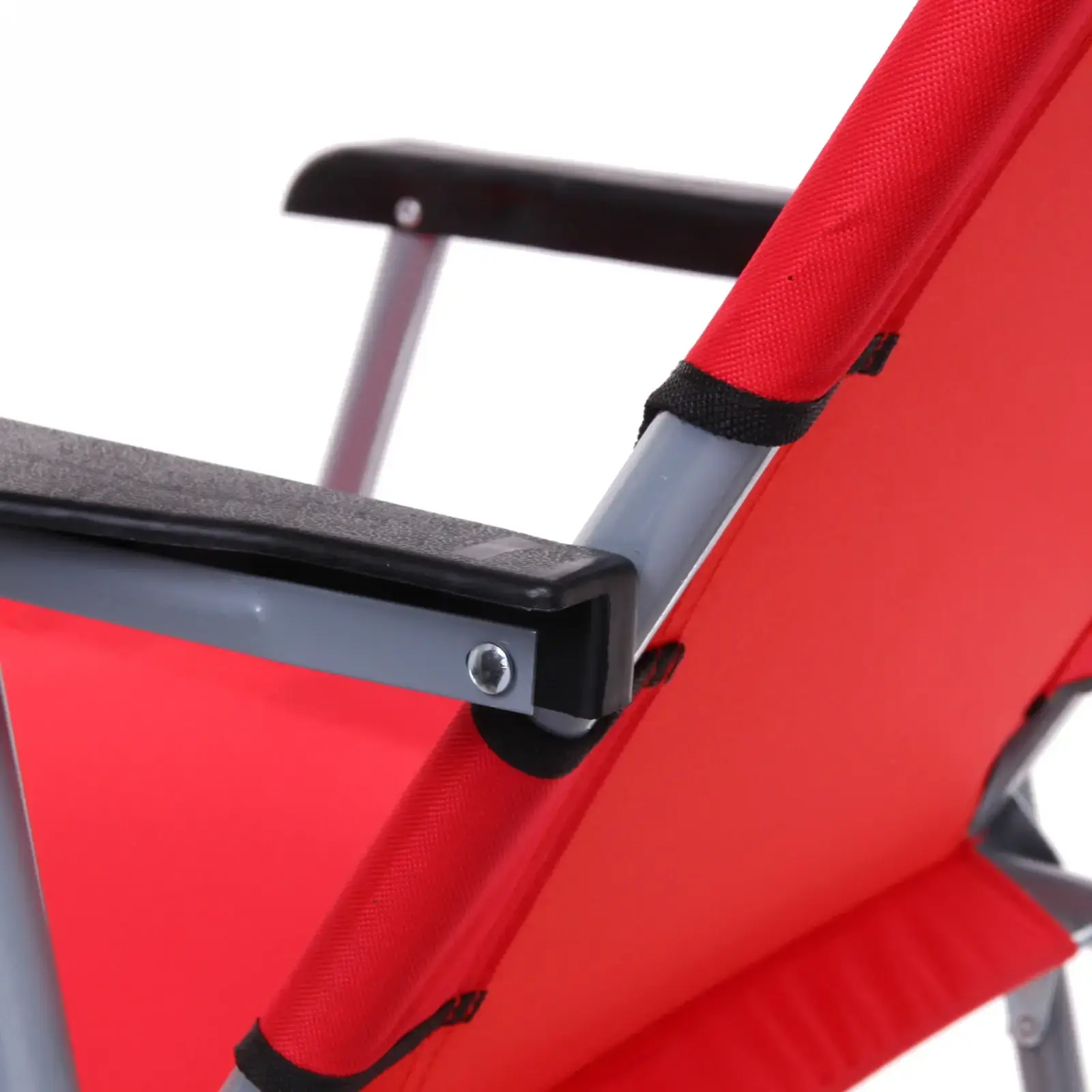 Стул выполнен в классическом красном цвете, который легко впишется в любой интерьер. Обивка стула выполнена из прочного текстиля, а каркас — из металлических труб, окрашенных в серебристый цвет. Подлокотники стула черного цвета с пластиковыми накладками добавляют дополнительный комфорт. Складная конструкция позволяет легко транспортировать и хранить стул, что делает его идеальным выбором для активного образа жизни.