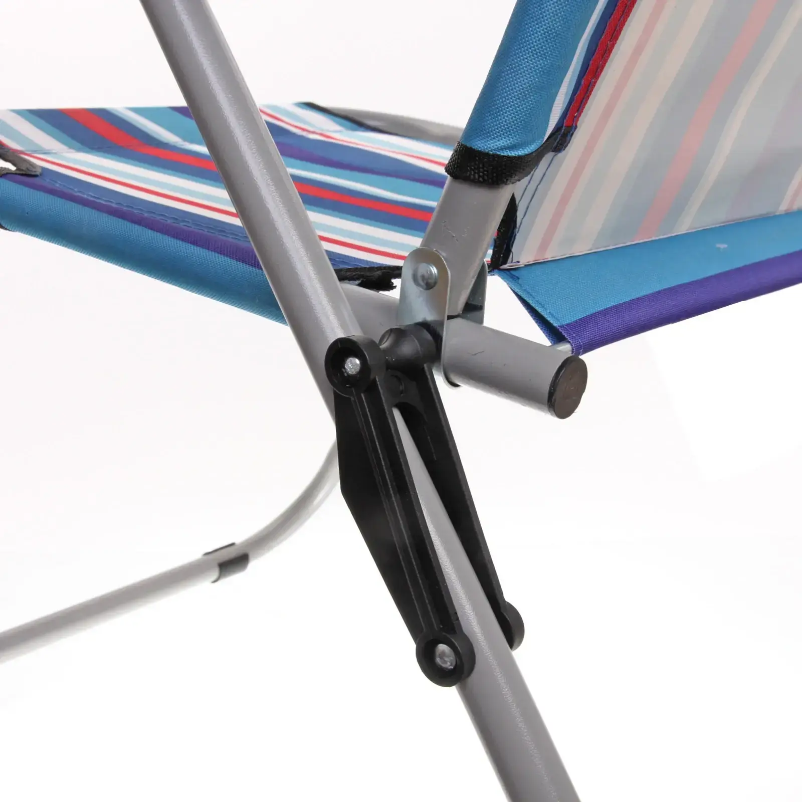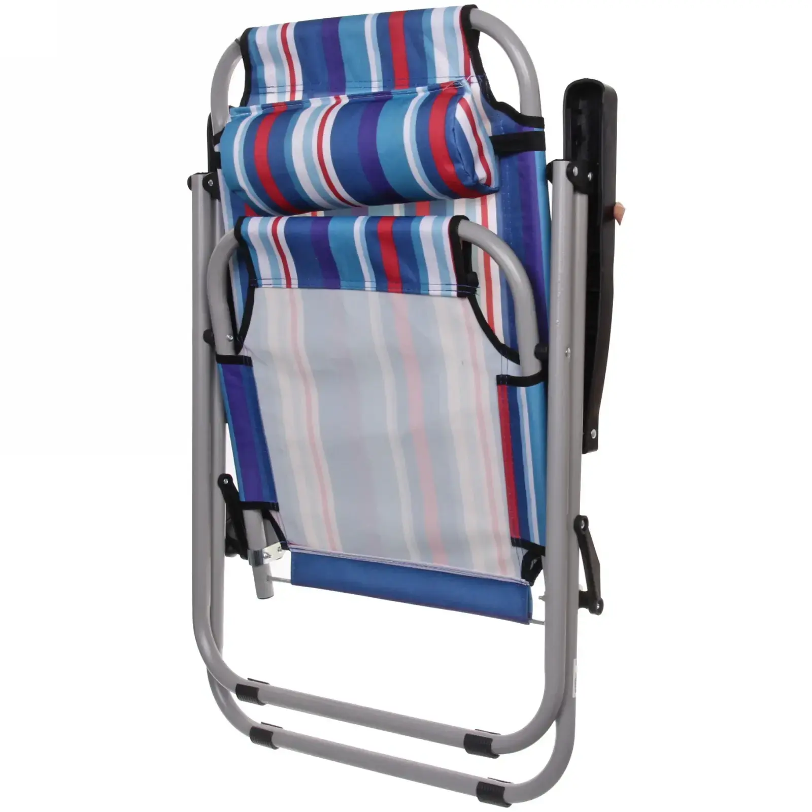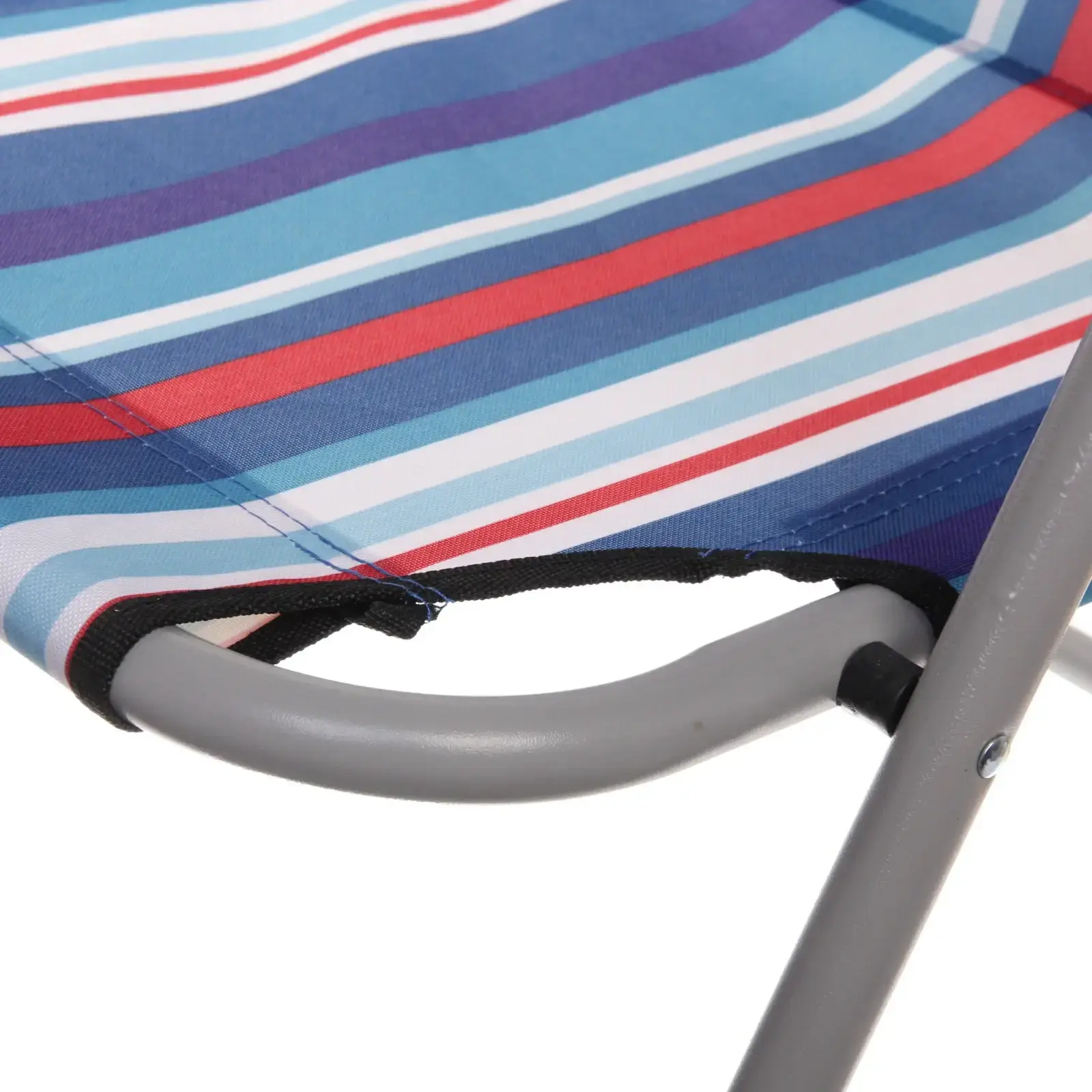 Размеры стула составляют 93*54*64 см, что делает его достаточно просторным для комфортного сидения. Обивка выполнена из текстиля с ярким полосатым дизайном, а каркас — из прочного металла, что обеспечивает надежность и устойчивость. Стул доступен в сине-красных цветах, что добавляет яркости вашему отдыху на природе.