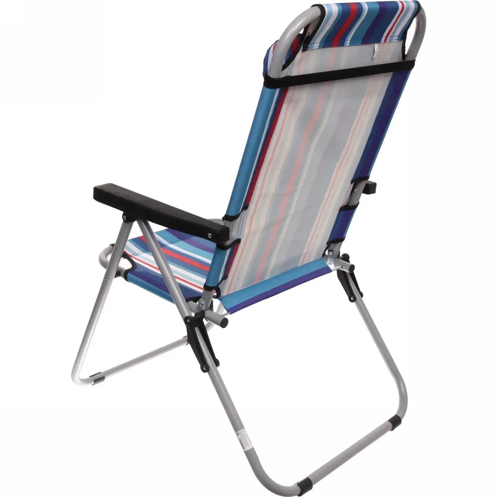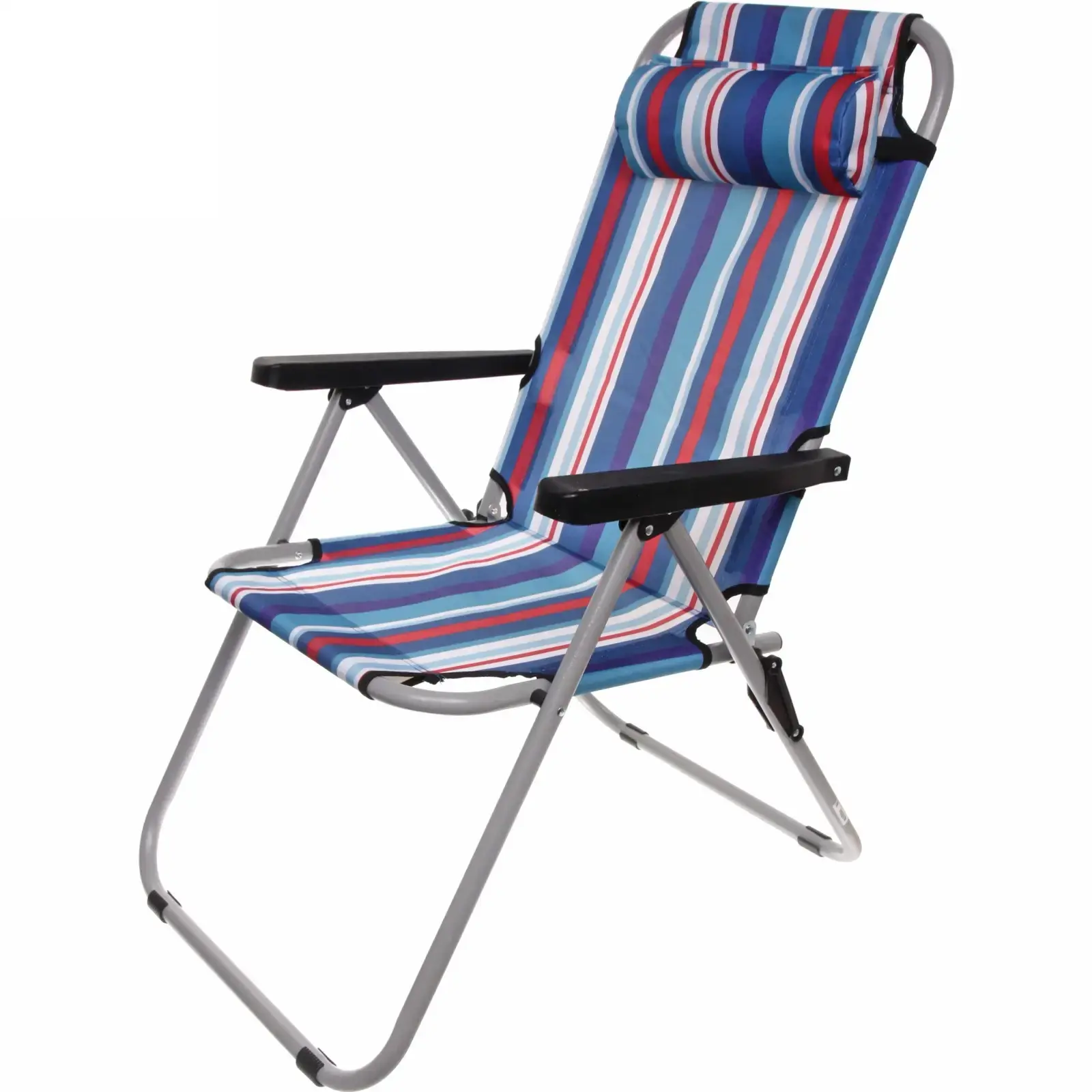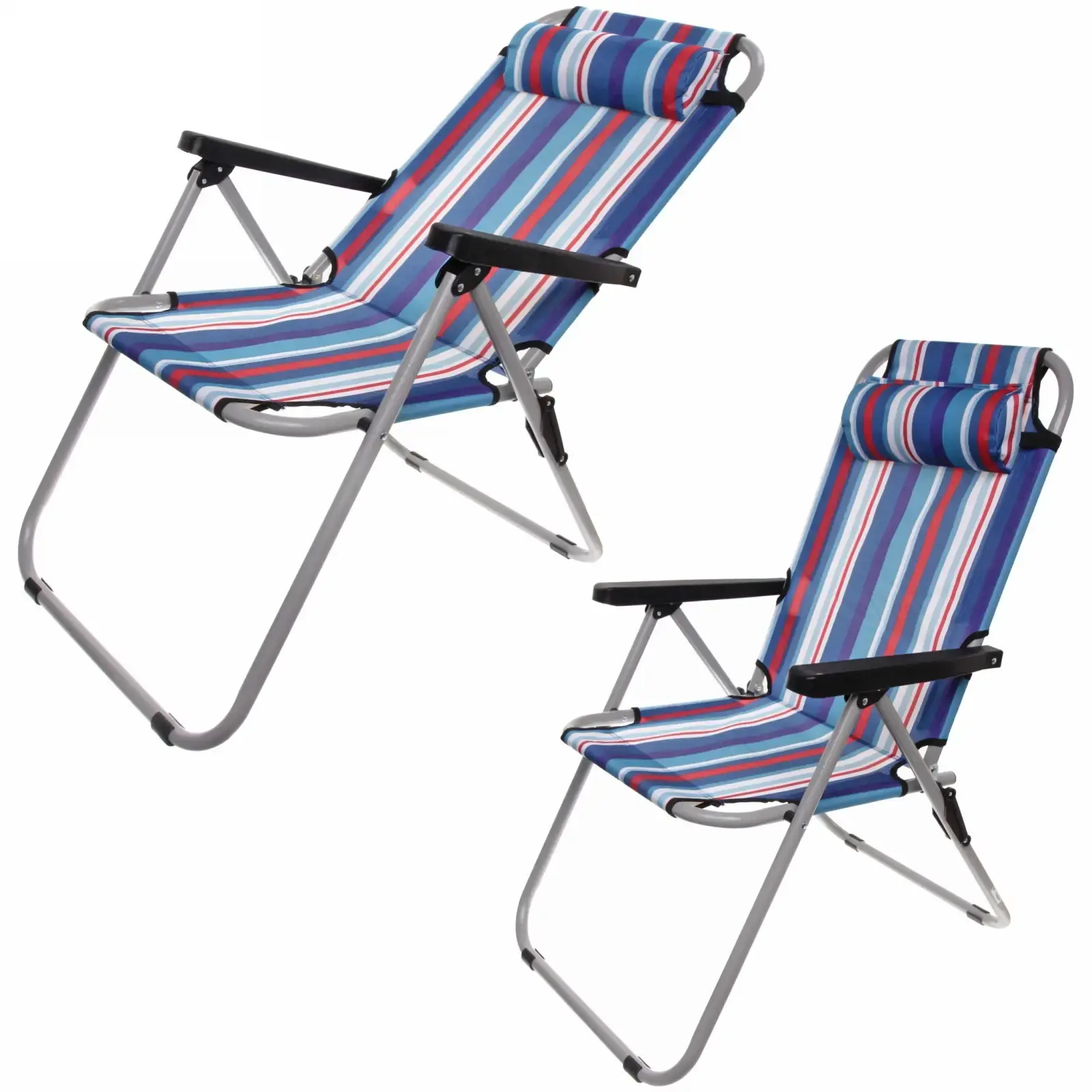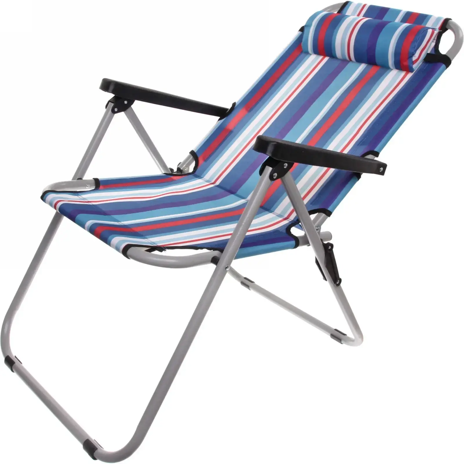 Размеры стула составляют 93*54*64 см, что делает его достаточно просторным для комфортного сидения. Обивка выполнена из текстиля с ярким полосатым дизайном, а каркас — из прочного металла, что обеспечивает надежность и устойчивость. Стул доступен в сине-красных цветах, что добавляет яркости вашему отдыху на природе.