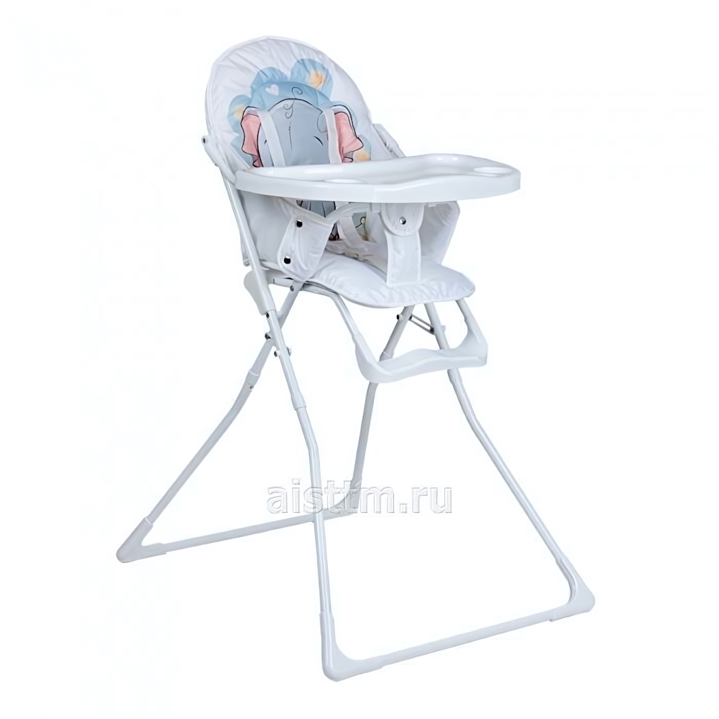Стул выполнен из качественных материалов: белый металлический каркас обеспечивает надежность, а пластиковая столешница легко моется. Обивка сиденья из ткани светлого цвета с рисунком слоненка добавляет уют и радость в процесс кормления. Размеры стула не указаны, но он спроектирован так, чтобы быть удобным для детей разных возрастов.