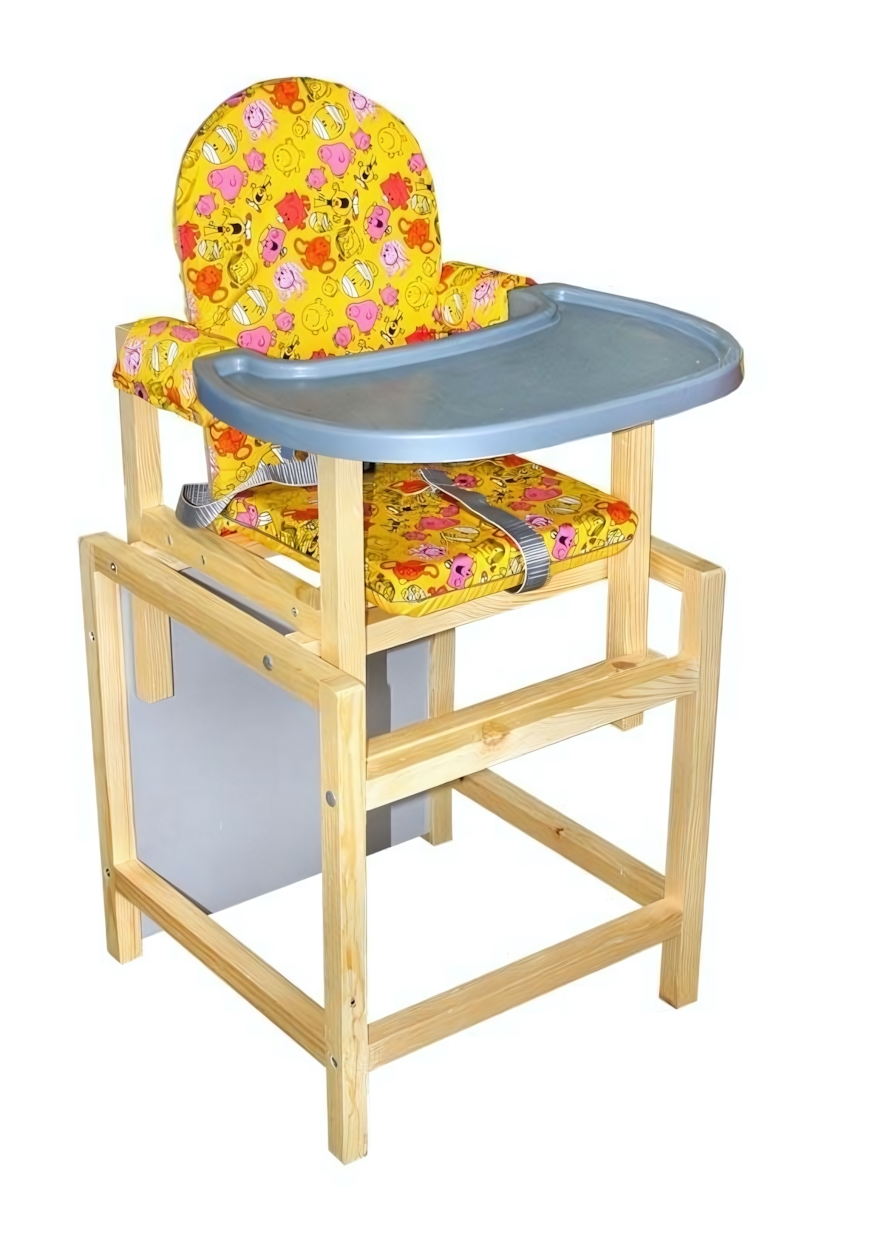 Деревянный стульчик для кормления с ярким дизайном станет незаменимым помощником для родителей. Желтая обивка с мультяшными персонажами создает позитивную атмосферу, а эргономичная форма обеспечивает правильную посадку ребенка.