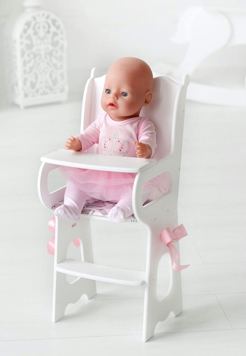 Стульчик выполнен из гипоаллергенных европейских красок, что обеспечивает безопасность и долговечность. Мягкое сиденье из 100% хлопка гарантирует комфорт для куклы, а изящные атласные бантики добавляют аккуратности и привлекательности изделию. Конструкция с классическим дизайном и деталями из дерева отлично подойдет для игр и развития воображения.