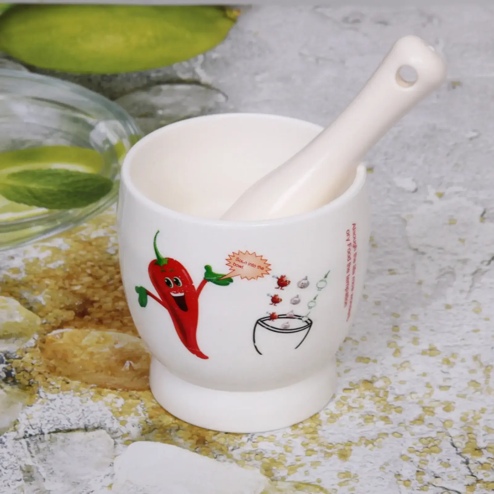 Выбирая эту ступку, вы получаете не только качественный инструмент, но и стильный элемент кухонной утвари. Яркий дизайн с изображением улыбающегося перца добавляет игривости и вдохновения в процесс готовки. Пластиковый материал делает её легкой и удобной в использовании, а также легко моется после применения.