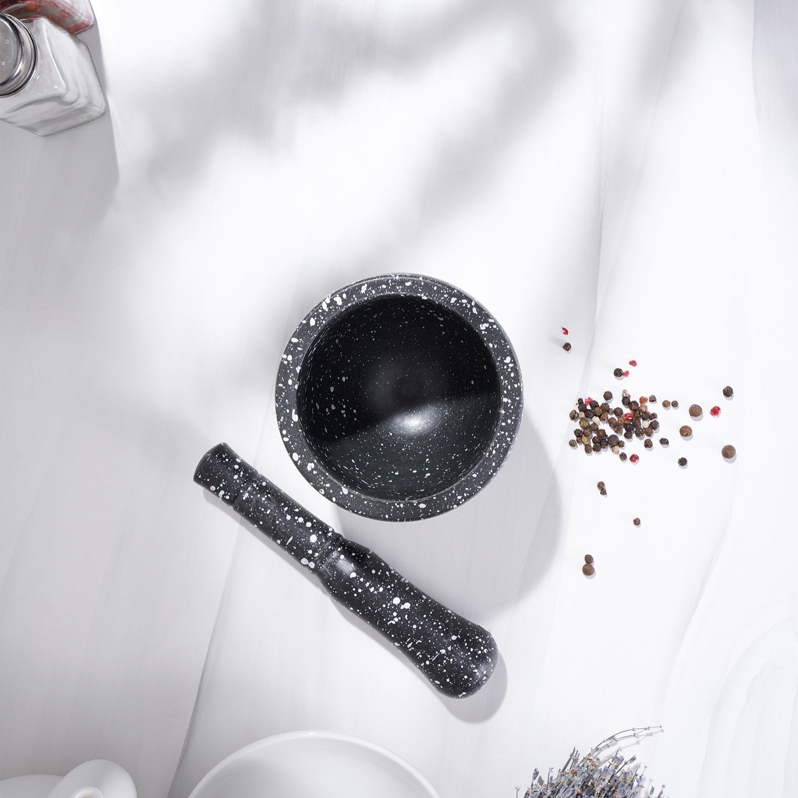 Эта ступка с пестиком станет вашим незаменимым помощником на кухне, позволяя легко и быстро измельчать специи, травы и другие ингредиенты. Благодаря своему элегантному черному цвету с белыми вкраплениями, она не только функциональна, но и станет стильным дополнением вашего кухонного интерьера.