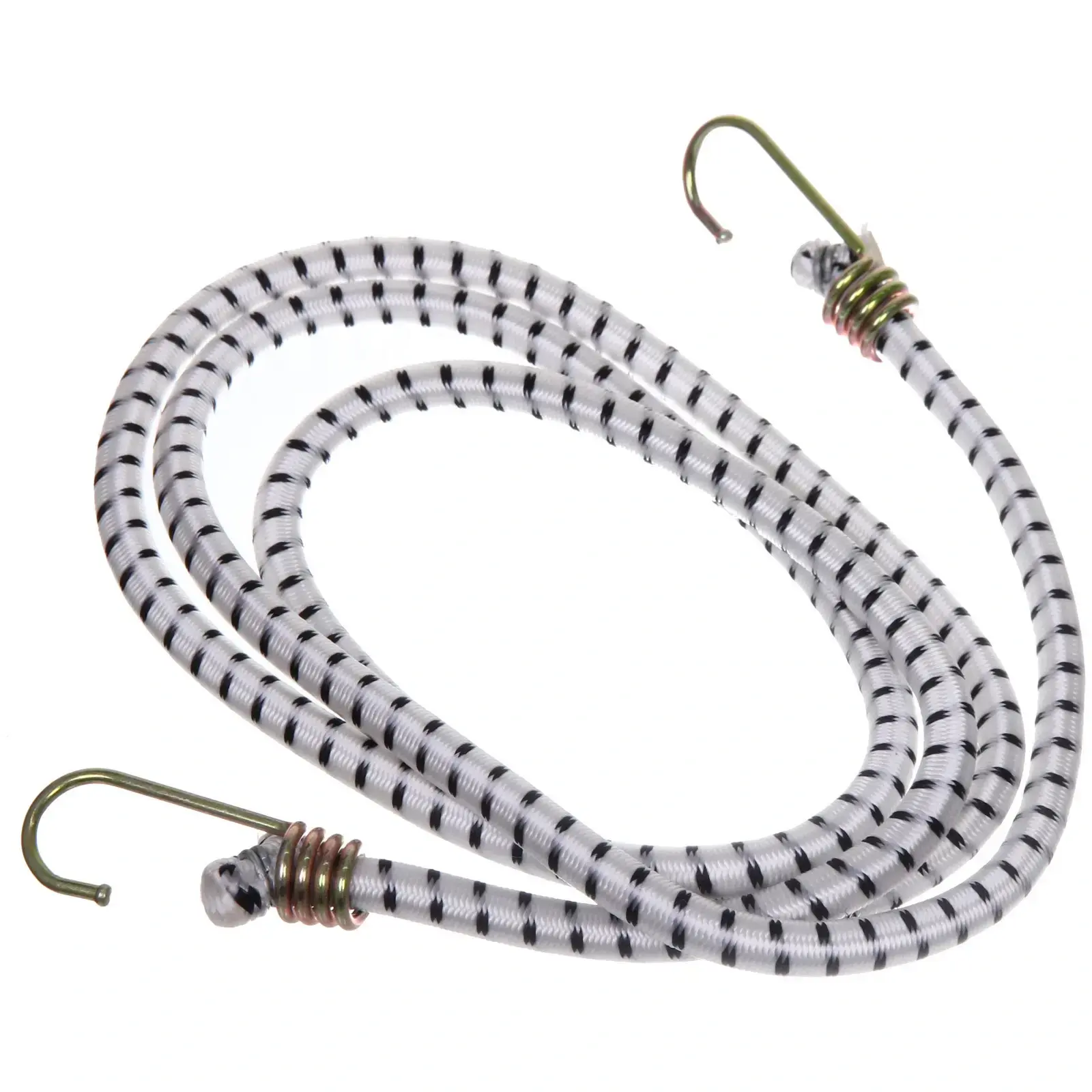Стяжка выполнена из резины и текстиля, что делает ее устойчивой к износу и повреждениям. Белый цвет с черными полосами придает ей стильный вид, а металлические крючки с золотистым покрытием добавляют прочности. Не упустите возможность сделать вашу жизнь проще и удобнее с помощью этой стяжки для груза!