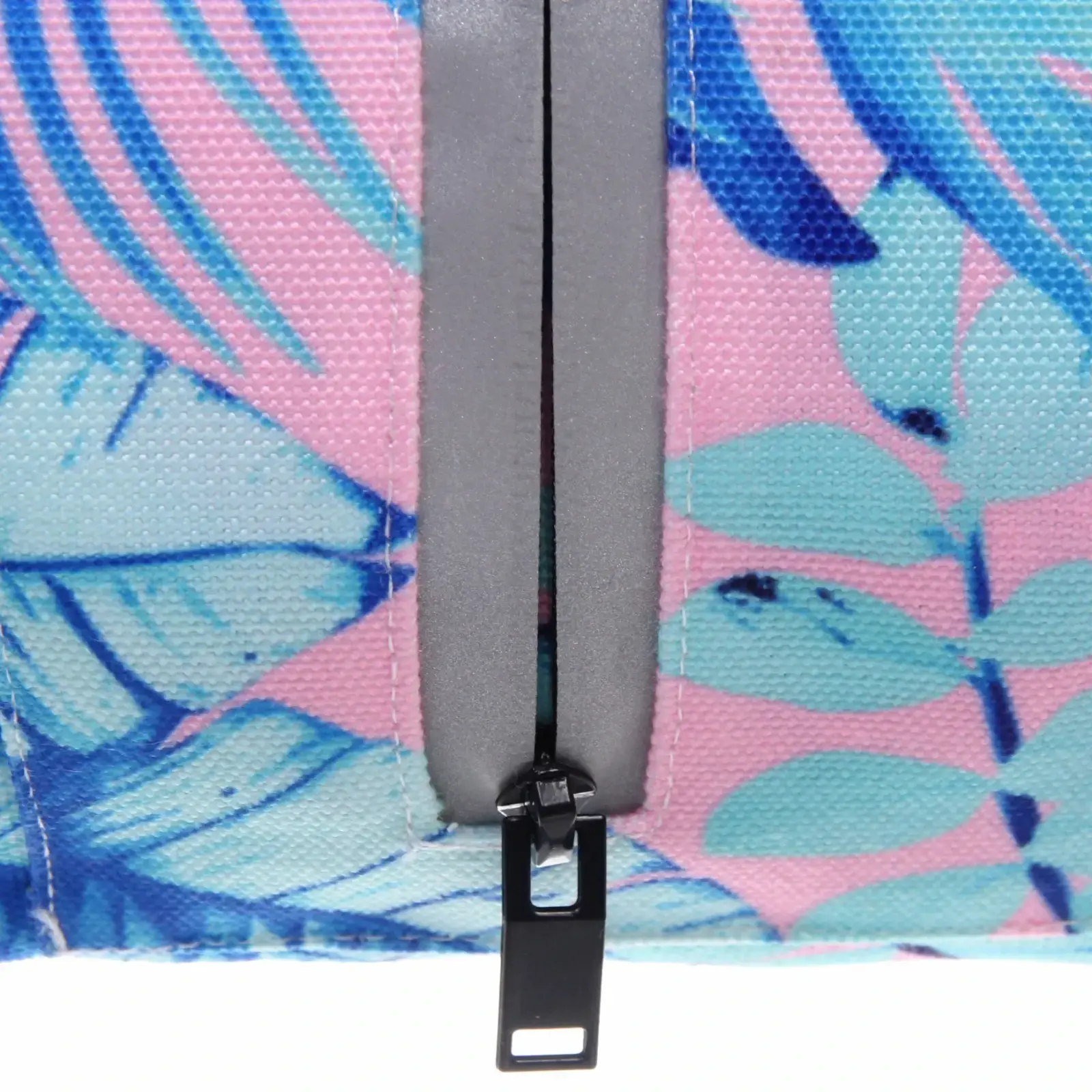 Изделие выполнено из износостойкого текстиля, который сохраняет форму после многочисленных стирок. Все швы усилены двойной строчкой, а металлические элементы фурнитуры защищены от коррозии. Розовый фон с контрастными сине-зелёными листьями сохраняет насыщенность цвета даже после активной эксплуатации.