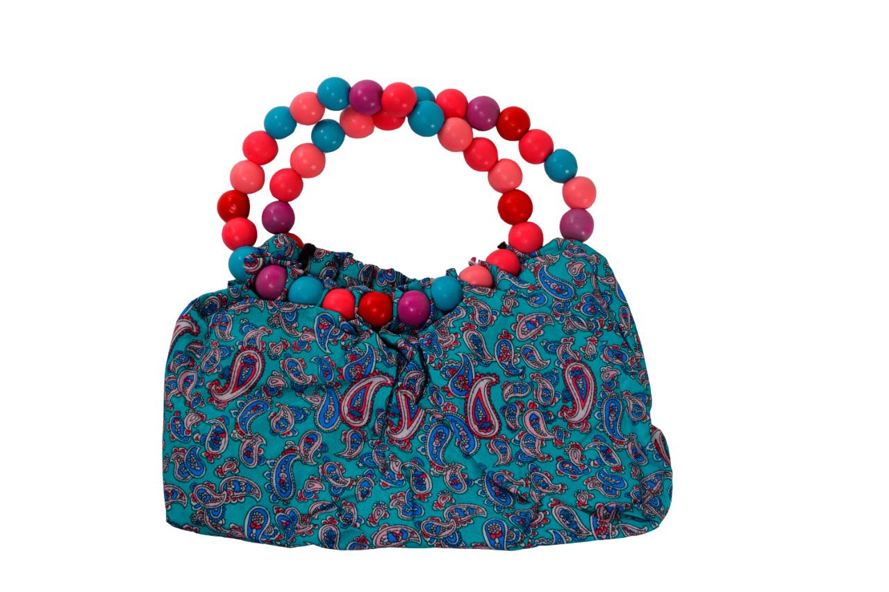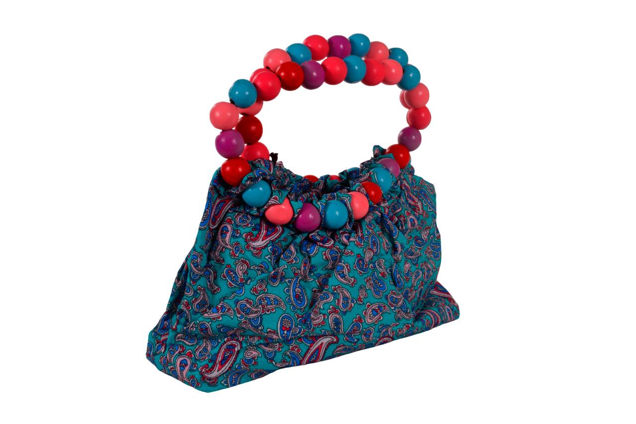 Компактный размер сумки (примерно 30х30 см) делает её универсальной для разных ситуаций – от прогулки до офиса. Разноцветные ручки добавляют игривости, а бирюзовый фон создает летнее настроение.