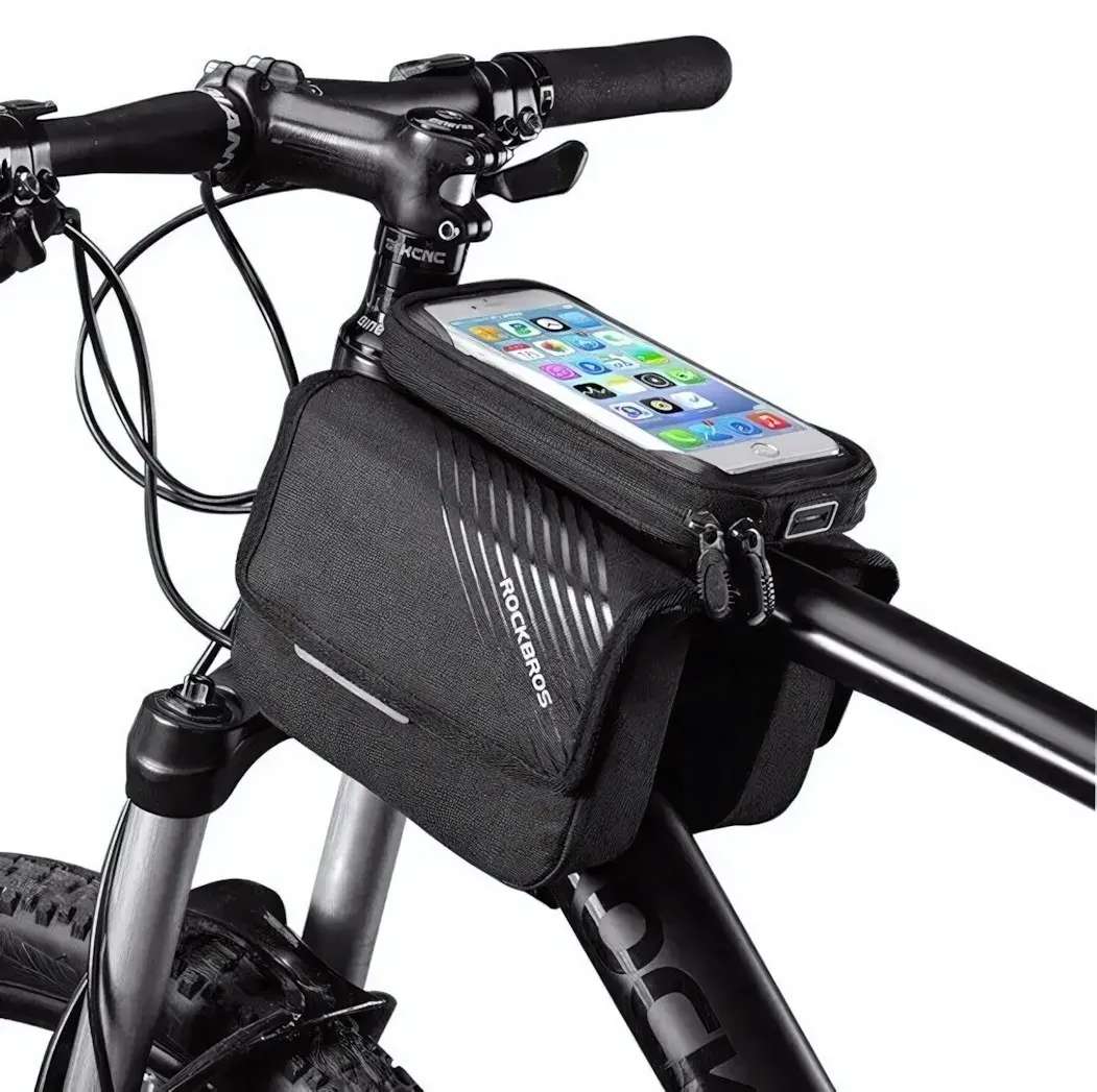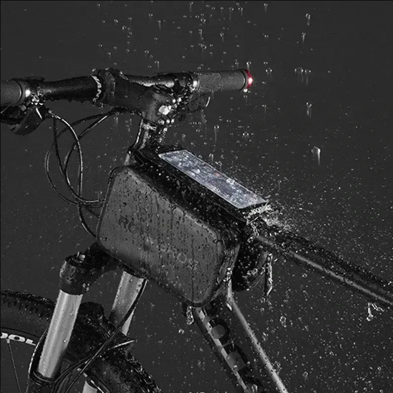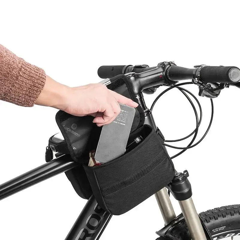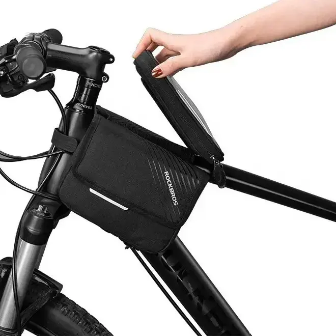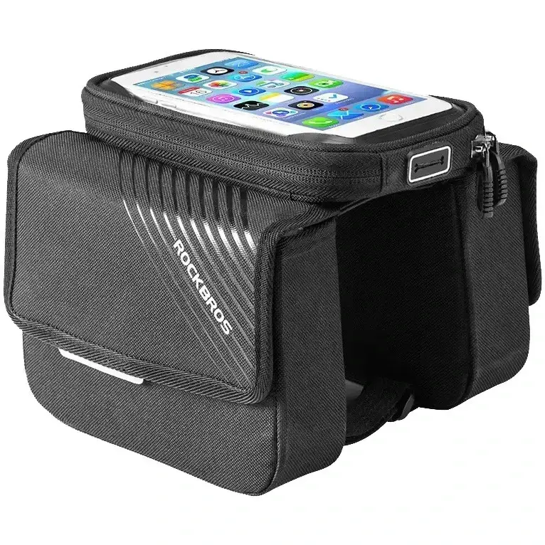 Сумка легко крепится на раму велосипеда с помощью текстильных ремней с липучками, что обеспечивает надежную фиксацию. Она идеально подходит для хранения мелочей, таких как инструменты, запасные части для велосипеда, ключи и портмоне. Прозрачная вставка на верхней части сумки позволяет удобно использовать телефон, не вынимая его из чехла.